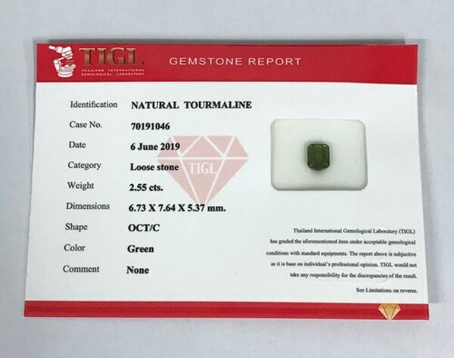 WEIGHT : 2.55 cts;STONE NAME : Natural Tourmaline ;SIZE ( L x W x D ) : 7.64 x 6.73 x 5.37 mm ;COLOR : Chrome Green;SHAPE : Octagon;QUANTITY : 1 piece;LUSTER : Excellent;CLARITY : IF-VVS;HARDNESS : 7;ORIGIN : Mozambique; TREATMENT : Unheated 100% Natural;