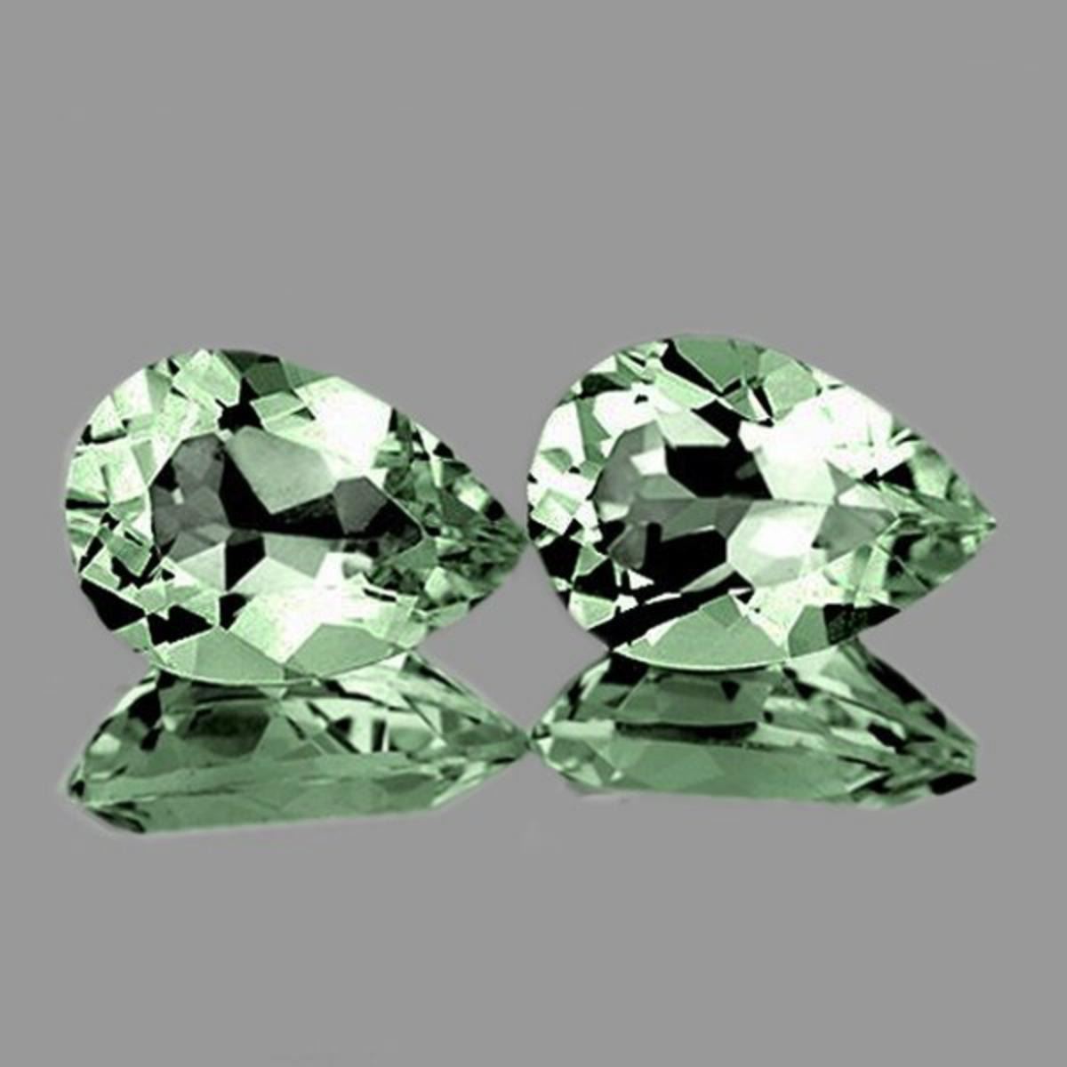 Natural Green Amethyst (Prasiolite)SIZE ( L x W x D ) : 10 x 7 mmCOLOR :LIGHT Green SHAPE : Pear QUANTITY : 2 piecesLUSTER : Excellent CLARITY : FLAWLESS-VVS BEST QUALITYHARDNESS : 7ORIGIN : Brazil TREATMENT : 100% Natural Unheated