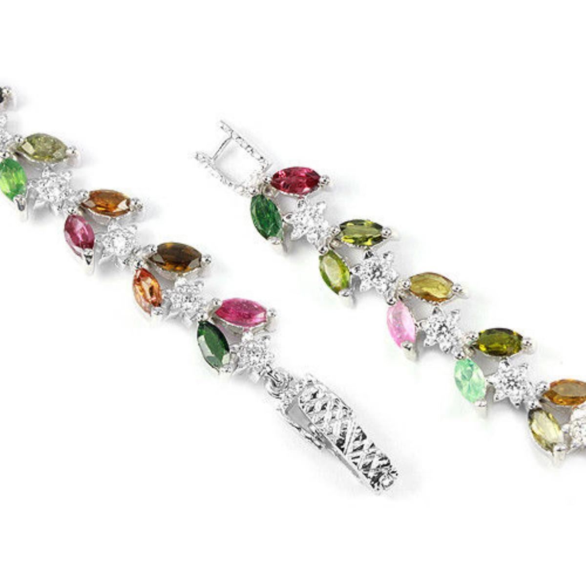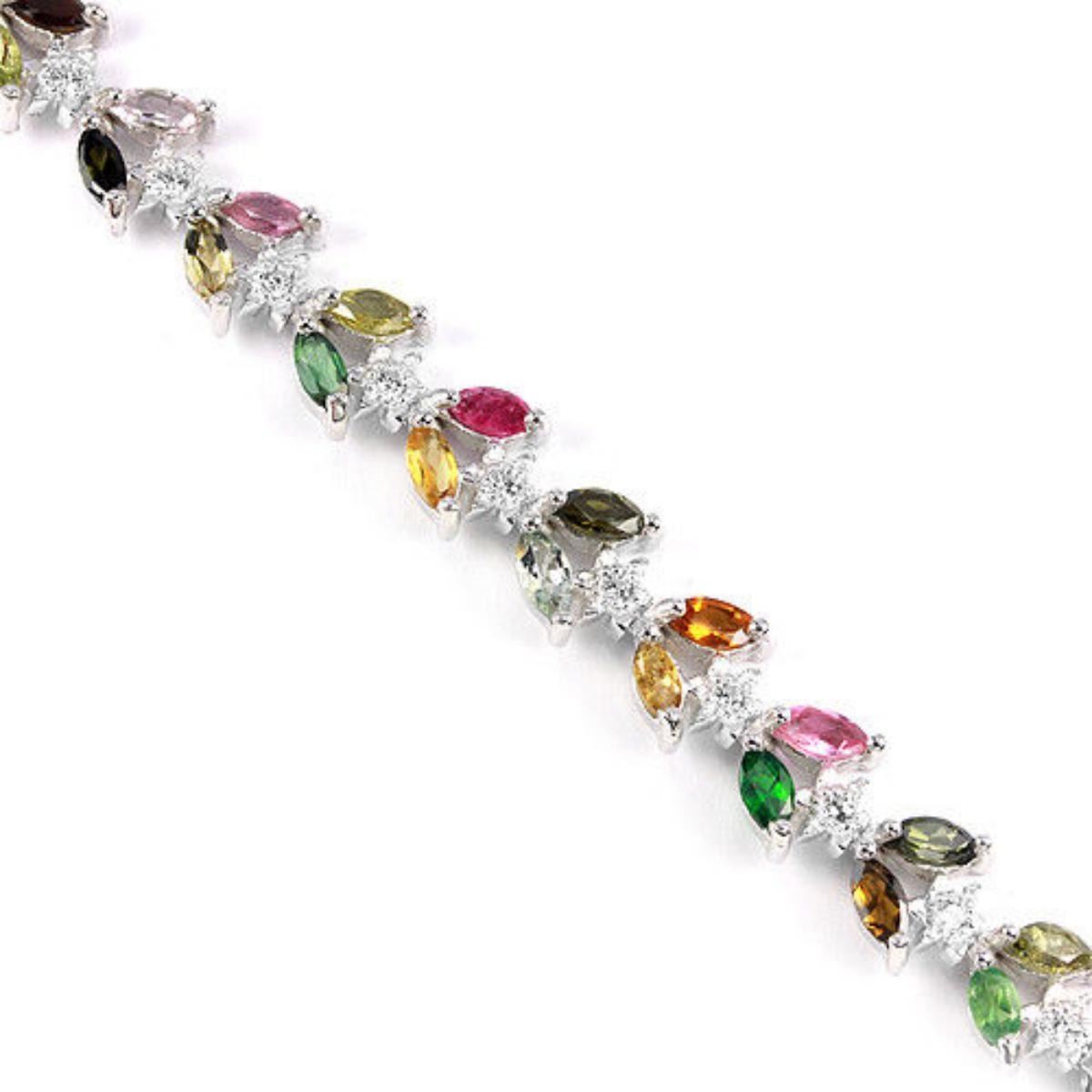 NATURAL MULTI COLOR TOURMALINE  CZ 925 SILVER BRACELET 14K WHITE GOLD COATING; LENGTH OF ITEM (Inch.) 7.50 ( RESIZE : NO ) ITEM QUANTITY 1 STONE SHAPE MARQUISE PORTUGUESE CUT STONE DIMENSION 5 X 2.5 MM. ITEM WEIGHT 17.9 GRAM COLOR MULTI COLOR CLARITY IF, VVS-VS LUSTER DAZZLING TREATMENT UNHEATED ORIGIN OF STONE AFRICA HARDNESS 7.5 WHITE CUBIC ZIRCONIA 2 MM.