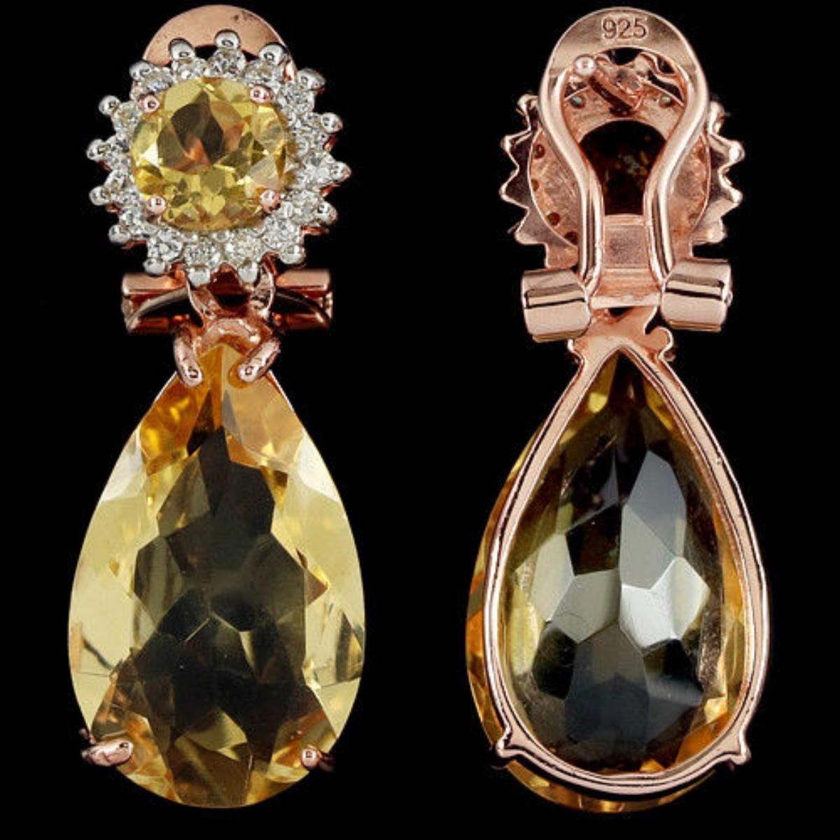 ORANGISH YELLOW CITRINE CZ 925 SILVER EARRING 14K WHITE-PINK GOLD COATING;STONE SHAPE PEAR ROUND PORTUGUESE CUT STONE DIMENSION 18 X 11 MM. , 6 MM. ITEM WEIGHT 7.8 GRAM COLOR ORANGISH YELLOW CLARITY IF TO VVS LUSTER ENCHANTING TREATMENT NATURAL UNHEATED ORIGIN OF STONE BRAZIL HARDNESS 7 ; FACE OF EARRING 29 X 11 MM. WHITE CUBIC ZIRCONIA 1.2 MM.