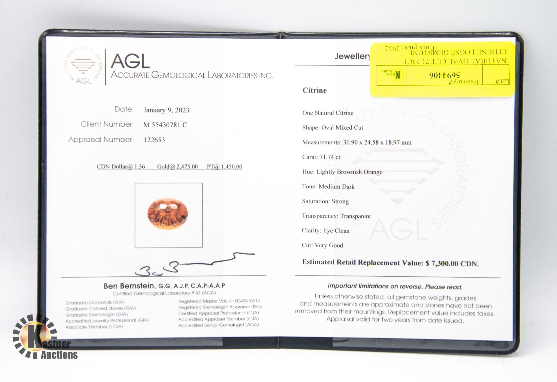 MEASURING 31.90 X 24.58 X 18.97MM, HUE IS LIGHTLY BROWNISH ORANGE, TONE IS MEDIUM DARK, SATURATION IS STRONG. TRANSPARENT STONE WITH EYE CLEAN CLARITY AND VERY GOOD CUT. COMES WITH APPRAISAL FROM AGL (122653) WITH APPRAISED VALUE $7,300.00 **ALL ITEMS MUST BE REMOVED BY 5PM SATURDAY, JANUARY 13TH 2023. ALL REMAINING ITEMS WILL BE SUBJECT TO A $6.00 PER DAY STORAGE CHARGE. ANY ITEMS REMAINING AFTER MONDAY, JANUARY 29TH, 2023 WILL BE CONSIDERED FORFEITED. NO REFUNDS WILL BE ISSUED FOR FORFEITED ITEMS. TO SCHEDULE A PICK UP APPOINTMENT CLICK HERE