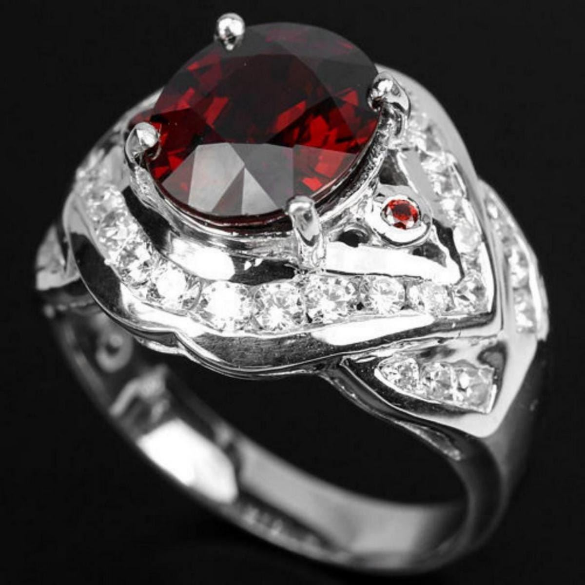 NATURAL DARK RED SPESSARTITE GARNET CZ 925 SILVER RING 14K WHITE GOLD COATING; RING SIZE -7.00 ( can be resized )STONE SHAPE-OVAL PORTUGUESE CUT;STONE DIMENSION-10.2 X 8.2 X 5 MM.;ITEM WEIGHT-6.1 GRAM;COLOR-DARK RED;CLARITY-IF;LUSTER-ENCHANTING;TREATMENT-NATURAL UNHEATED;ORIGIN OF STONE-AFRICA;HARDNESS-7.5;FACE OF RING 20 X 15 MM. ;WHITE RED CUBIC ZIRCONIA