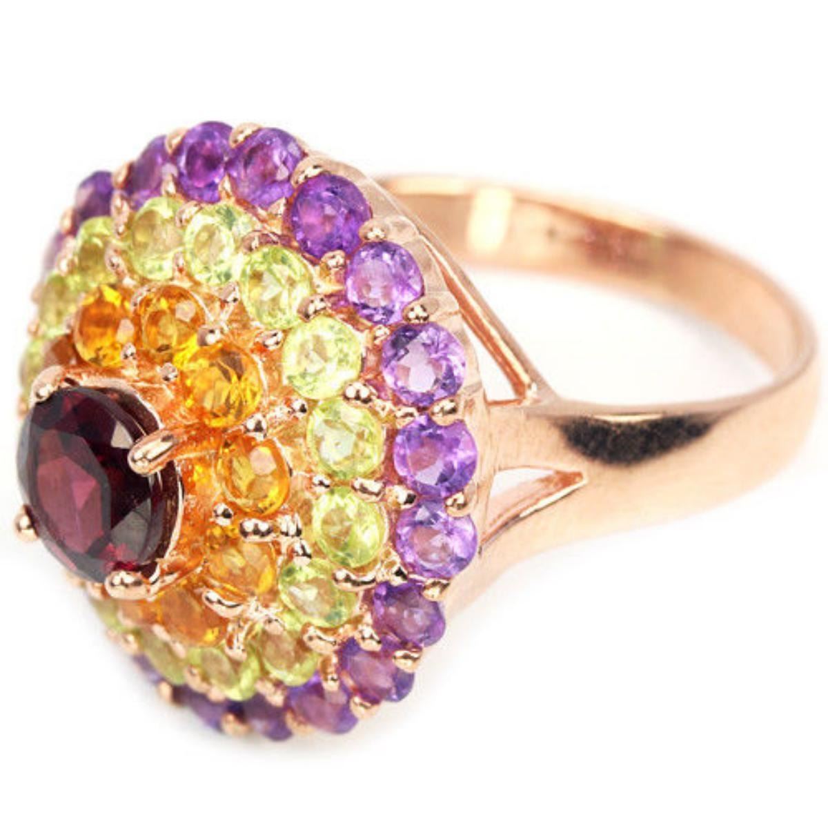NATURAL RHODOLITE CITRINE PERIDOT AMETHYST 925 SILVER RING 14K PINK GOLD COATING;RING SIZE 8.00 ( resizeable )ITEM QUANTITY1STONE SHAPEROUNDSTONE DIMENSION6 MM. & 3 MM.ITEM WEIGHT7.57 GRAMCOLORMULTI COLORCLARITYIF - VVSLUSTERALLURINGTREATMENTNATURAL UNHEATEDORIGIN OF STONEBRAZIL, AFRICA & ASIAHARDNESS6.5 - 7.5OTHERFACE OF RING 20 X 20 MM.
