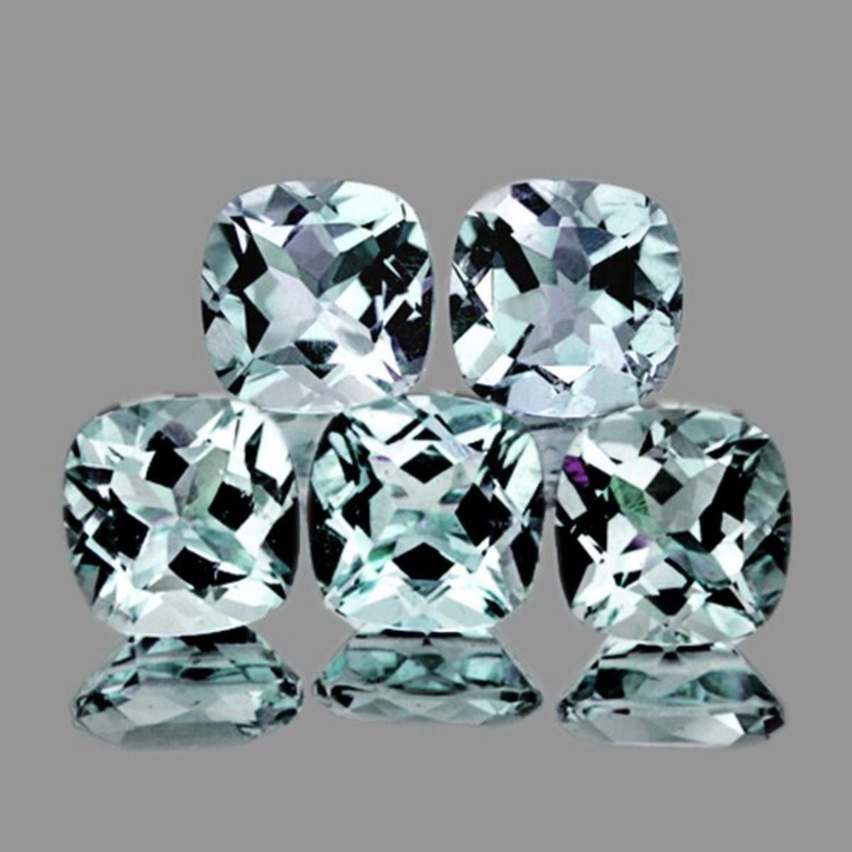 Natural AquamarineSIZE ( L x W x D ) : 4.00 mmCOLOR : Sky BlueSHAPE : CushionQUANTITY : 5 pieces LUSTER : ExcellentCLARITY : IF-VVSHARDNESS : 8ORIGIN : Santa Maria de Itabira TREATMENT : 100% Natural, Unheated