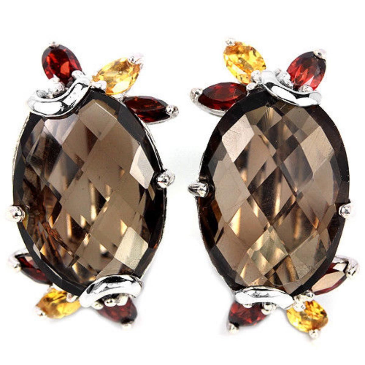 NATURAL SMOKY QUARTZ GARNET CITRINE 925 SILVER EARRING 14K WHITE GOLD COATING;STONE SHAPE OVAL PEAR STONE DIMENSION 18 X 13 MM. , 5 X 3 MM. , 5 X 2.5 MM. ITEM WEIGHT 10.54 GRAM COLOR MULTI COLOR CLARITY VVS TO VS LUSTER ELEGANT TREATMENT NATURAL UNHEATED ORIGIN OF STONE BRAZIL CAMBODIA HARDNESS 7 - 7.5 ; FACE OF EARRING 26 X 14 MM.