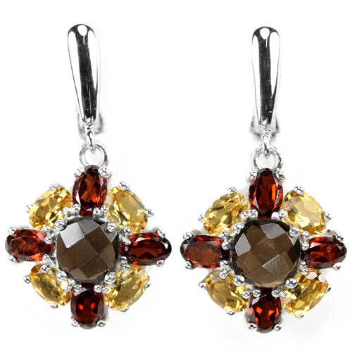 NATURAL SMOKY QUARTZ GARNET CITRINE 925 SILVER EARRING 14K WHITE GOLD COATING; STONE SHAPEROUND PORTUGUESE WITH CHECKER BOAD TABLE CUT OVAL PORTUGUESE CUTSTONE DIMENSION8 MM. 6 X 4 MM.ITEM WEIGHT10.67 GRAMCOLORMULTI COLORCLARITYIF - VVSLUSTERALLURINGTREATMENTUNHEATEDORIGIN OF STONEBRAZIL CAMBODIAHARDNESS7.0 - 7.5FACE OF EARRING 39 X 20 MM.