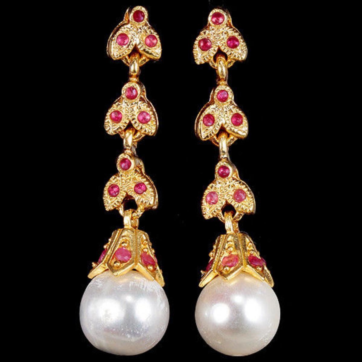 NATURAL WHITE PEARL & PINK RED RUBY 925 SILVER EARRING 14K YELLOW GOLD COATING; STONE SHAPEROUND CABOCHONSTONE DIMENSION11 MM.ITEM WEIGHT10.4 GRAMCOLORWHITECLARITYOPAQUELUSTERALLURINGTREATMENTUNHEATEDORIGIN OF STONEJAPANHARDNESS3 - 4kFACE OF EARRING 42 X 11 MM. RUBY 2 MM. & 1.2 MM.