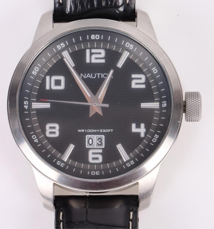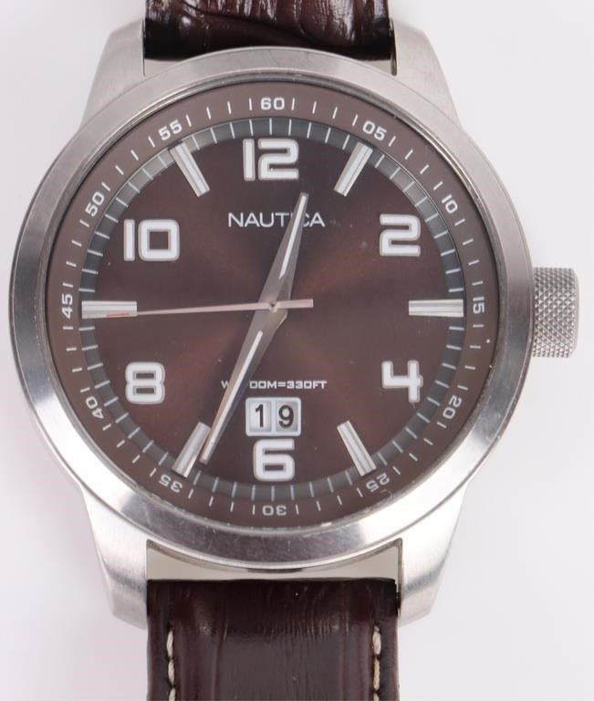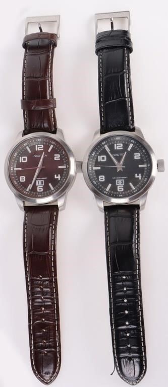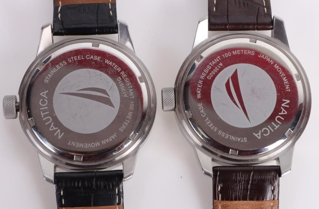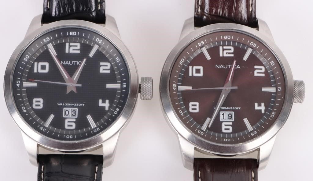 Nautica men's wristwatches lot of 2 to include: Nautica model A13552G with brown leather band & Nautica model A13551G with a black leather band. Both watches are water resistant up to 100meters.