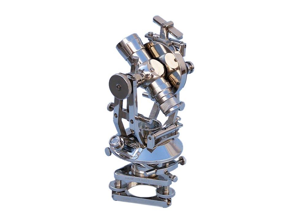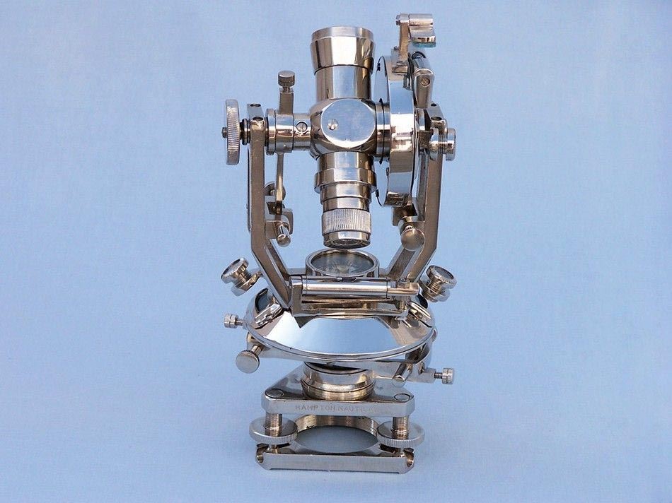 NAUTICAL 10" CHROME THEODOLITE **|**|** The azimuth and elevation axes can be read on a vernier scale with the aid of built-in magnifiers. Both axes have slow motion controls and the telescope can plunge and reverse to reduce bearing errors. With a magnetic compass mounted on top, the azimuth axis has a second spirit level mounted on the telescope with a mirror to assist in leveling while the telescope utilizes precision optics and has a chrome lens cover. The theodolite's 22-power non-inverting telescope has two focusing adjustments; one for the precision reticule focus and another for focusing the target.