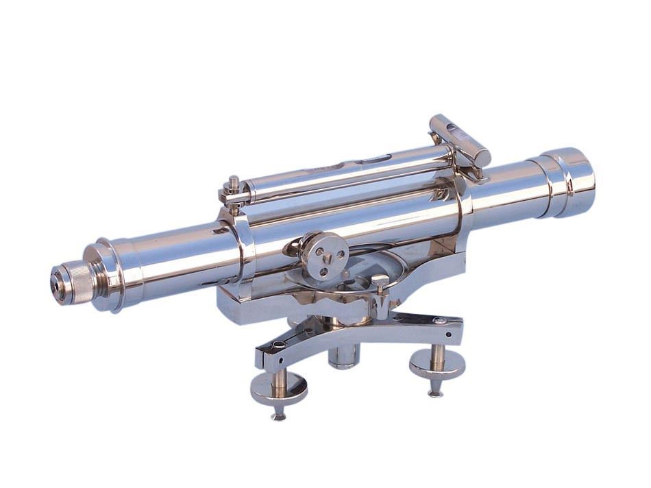 NAUTICAL 15" CHROME TOP BUBBLE DUMPY LEVEL **|**|** The Hampton Nautical Chrome Dumpy Level 15" (also known as an Engineer's Transit) is an instrument of impressive quality and craftsmanship. The Dumpy Level has a 20-power inverting telescope with precision crosshairs and two focusing adjustments. An adjustable spirit level with a protective cover is located on the top of the chrome telescope. On the inside of the cover is a mirror to assist in reading the spirit level. There are three leveling adjustments on the base and it is threaded for a surveyor's tripod mount.