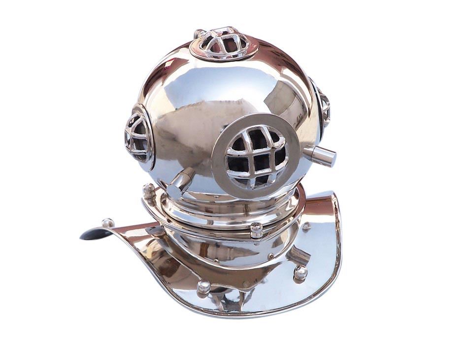 NAUTICAL 9" CHROME DIVERS HELMET **|**|** The Chrome Divers Helmet 9" is a perfect accent for any nautical themed room; the polished chrome finish adds a classy nautical feel not found in all diving helmet replicas. The miniature reproduction of an original U.S. Navy Mark V deep-sea diving helmet is constructed of solid, highly polished, heavy-duty chrome and features 4 viewing holes, helmet rivets, and replica latches. Place this beautifully crafted diving helmet on a desk, table, or shelf in any home or office to add a lovely conversation piece that no nautical d