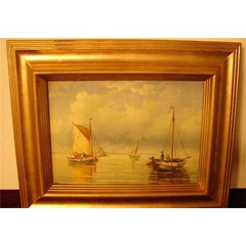 </font></strong>A Nice 20th Century Oil on Board depicting sail boats in water in a busy harbor of a locale like Annapolis, Maryland on the Eastern Shore in the Mid Atlantic Area, probably in the Washington, D.C./ Baltimore Chesapeake Bay area with a Nice blue sky. This painting has a nice frame measuring 8" X 10". Good Condition. This is a nice decorative small painting that is very desirable. No Signature.</font>