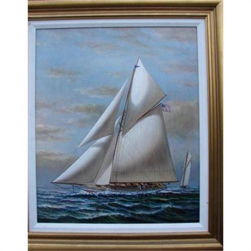Tayler was born in Massachusetts in 1968. He is a modern day painter who still paints and the fact that he was raised in New England within sigh of the Atlantic Ocean is evident in most of his paintings. His work depicts all facets of coastal areas and marine and nautical subjects. With great artistic talent that is evident and using a fine detailed manner, he creates works of extraordinary strength. He paints several versions of Sailing Ships. Single,double,triple and J Class. Eben though he actively paints and all of his paintings are hand painted by him and are not duplicated off of a computer or any type of modern technology. We are usually are lucky to acquire a few of his paintings a year. They are most sought after by clients and decorators on the East Cioast from Maine to Florida. This single "TWILIGHT SAIL" is framed. THE MEASUREMENTS OF THE CANVAS ONLY IS 20" x 24". The total dimensions including the gilded frame is 25 3/4" X 29 3/4". Additional images are available upon request.