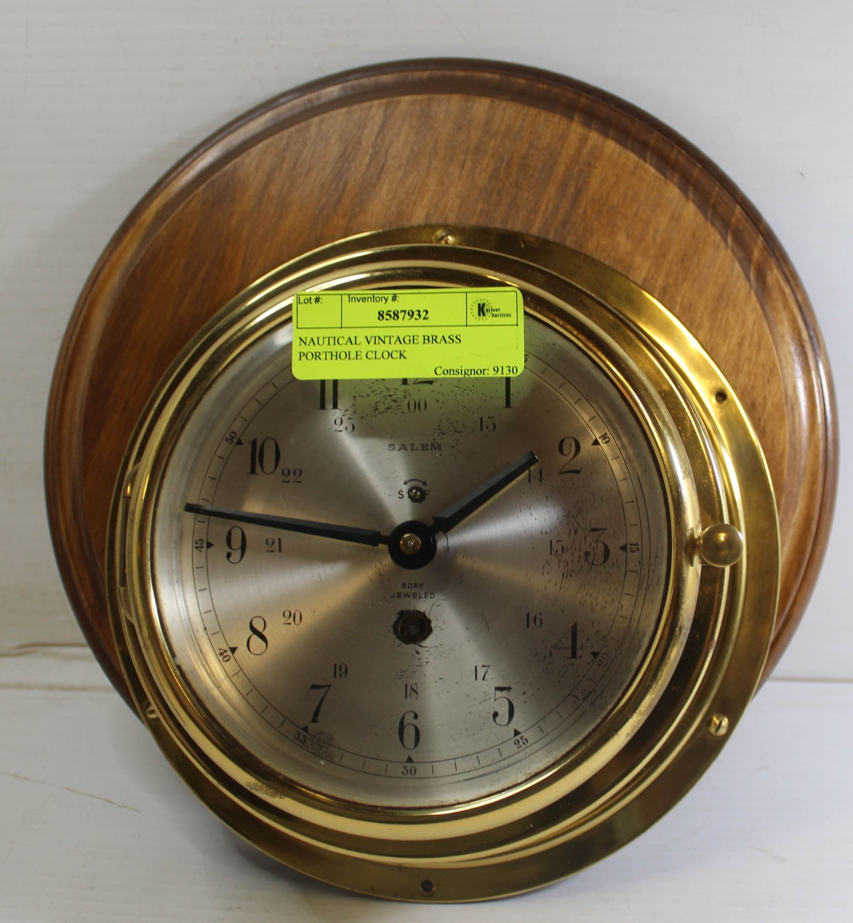 SALEM 8 DAY JEWELED, 8" DIAMETER C/W WOOD MOUNTING BASE, NO KEY, UNTESTED