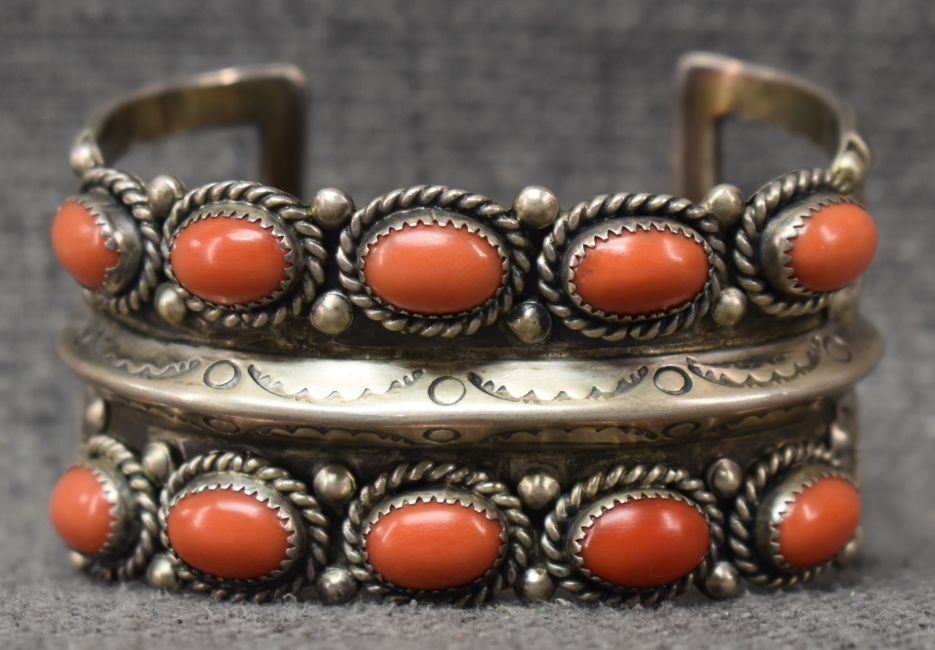1970-80's Navajo sterling silver stamped design with coral stones signed J Deboise 1.5" x 5.5" x 1.5" total weight 112 grams