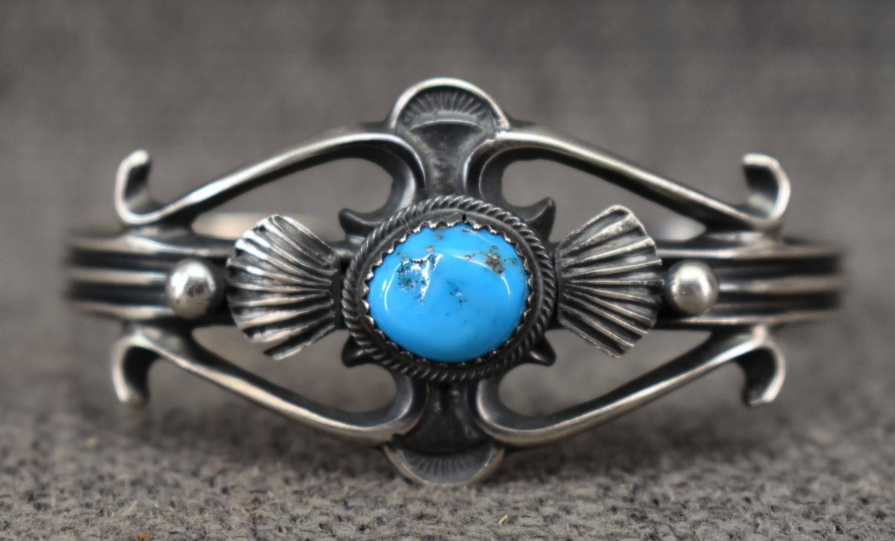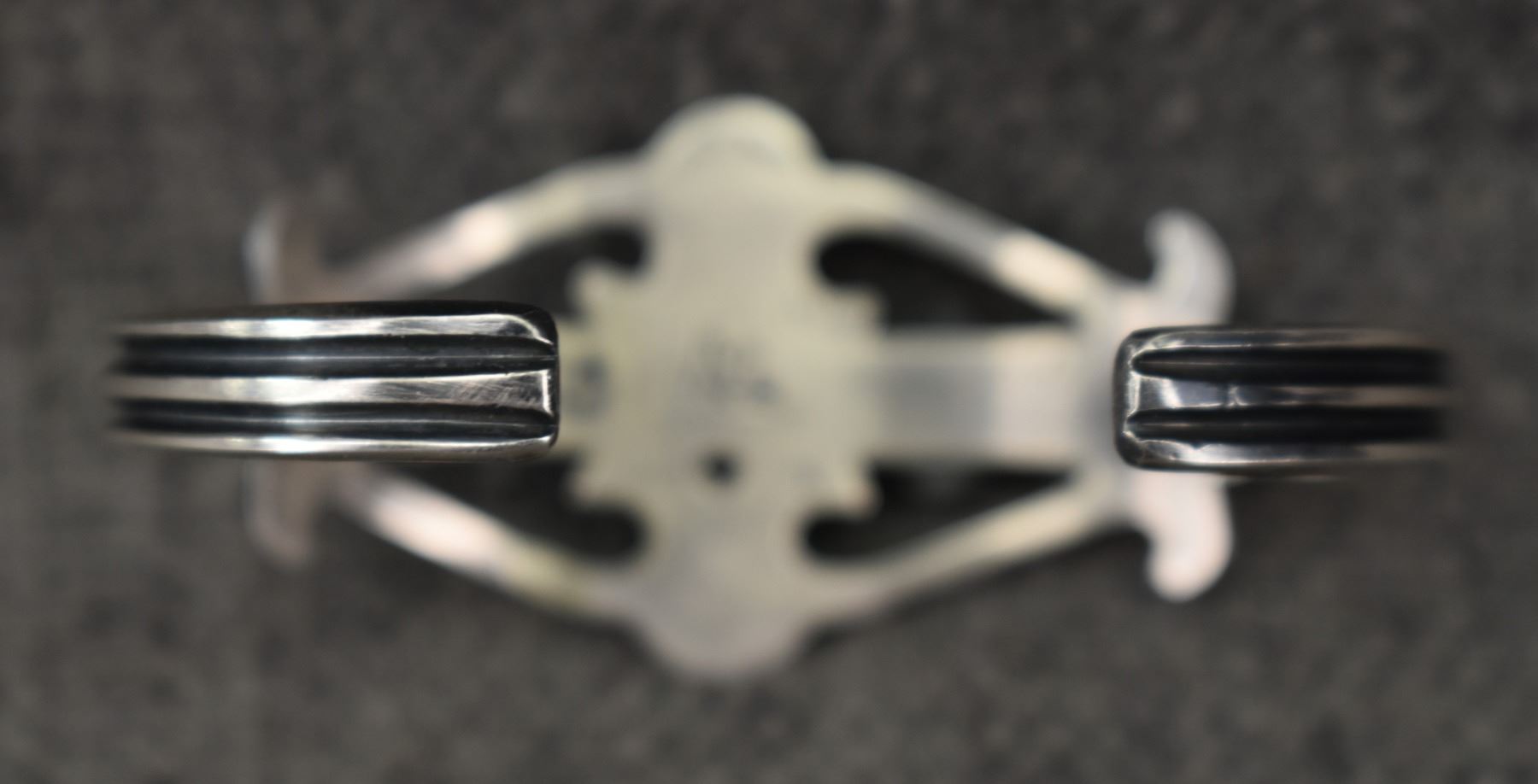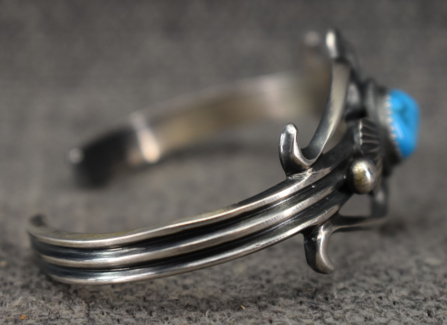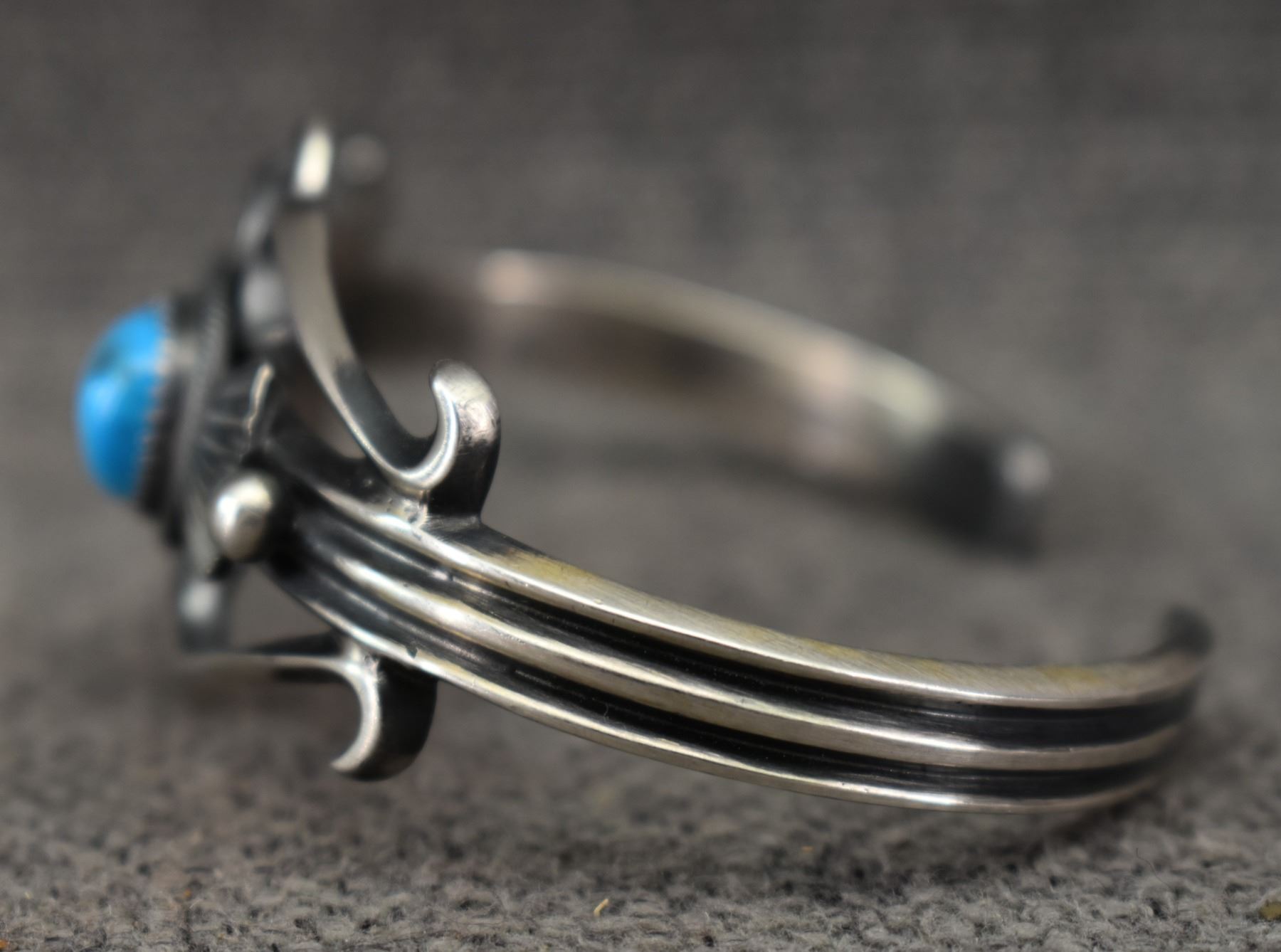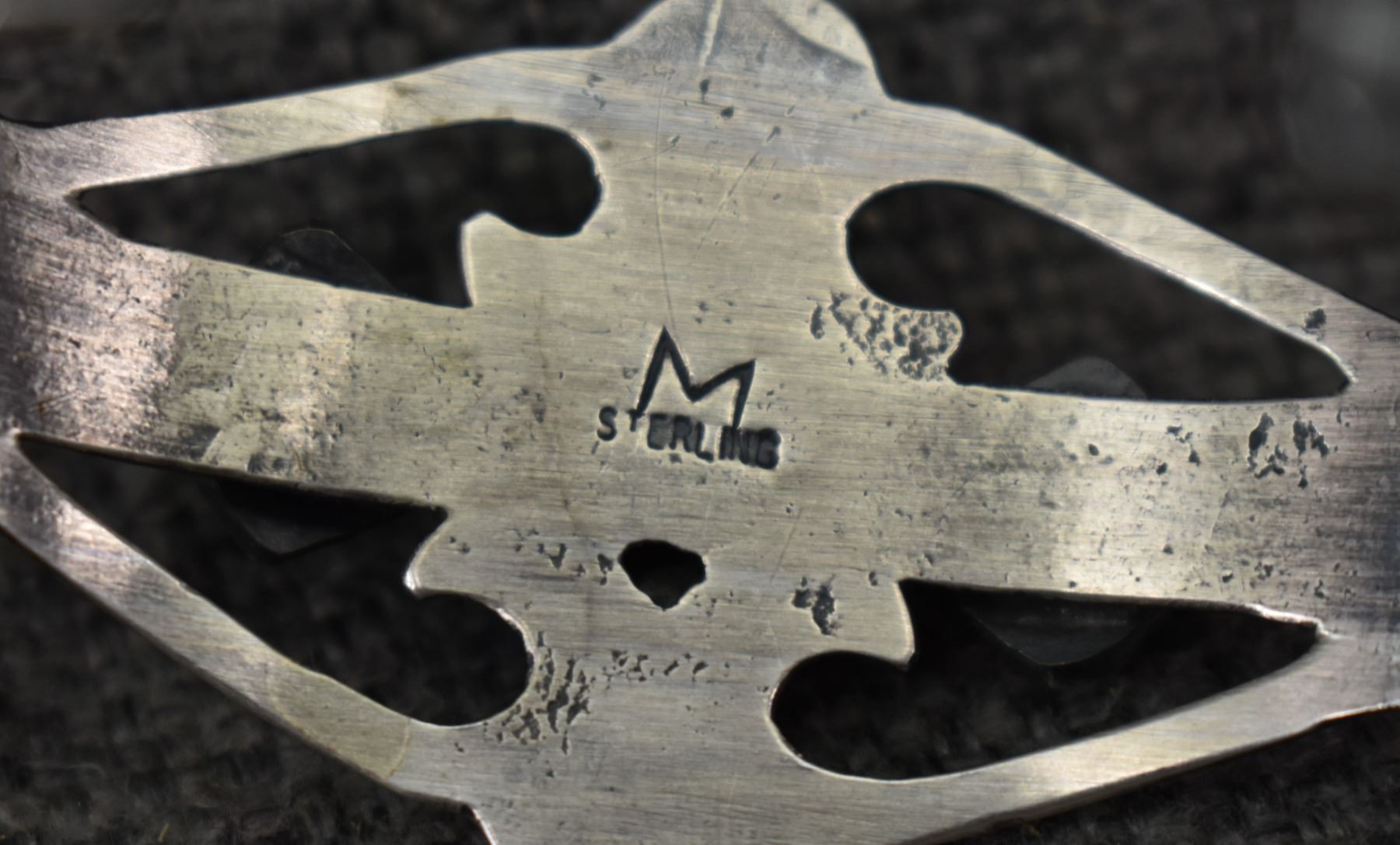 1990's Navajo, sterling silver sand cast and stamped design with turquoise stone signed M for Pete Morgan 1" x 5.5" x 1" total weight 30 grams