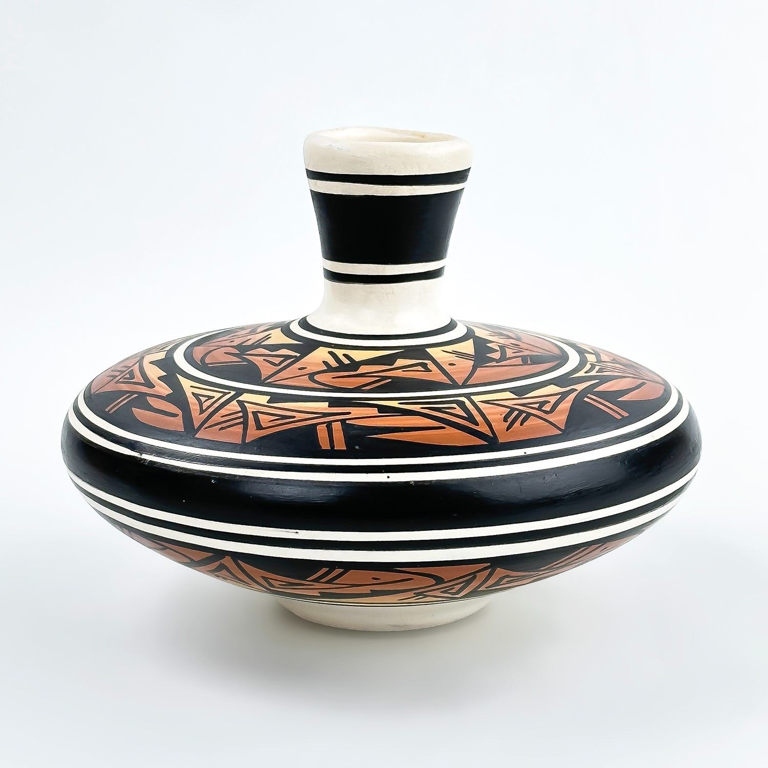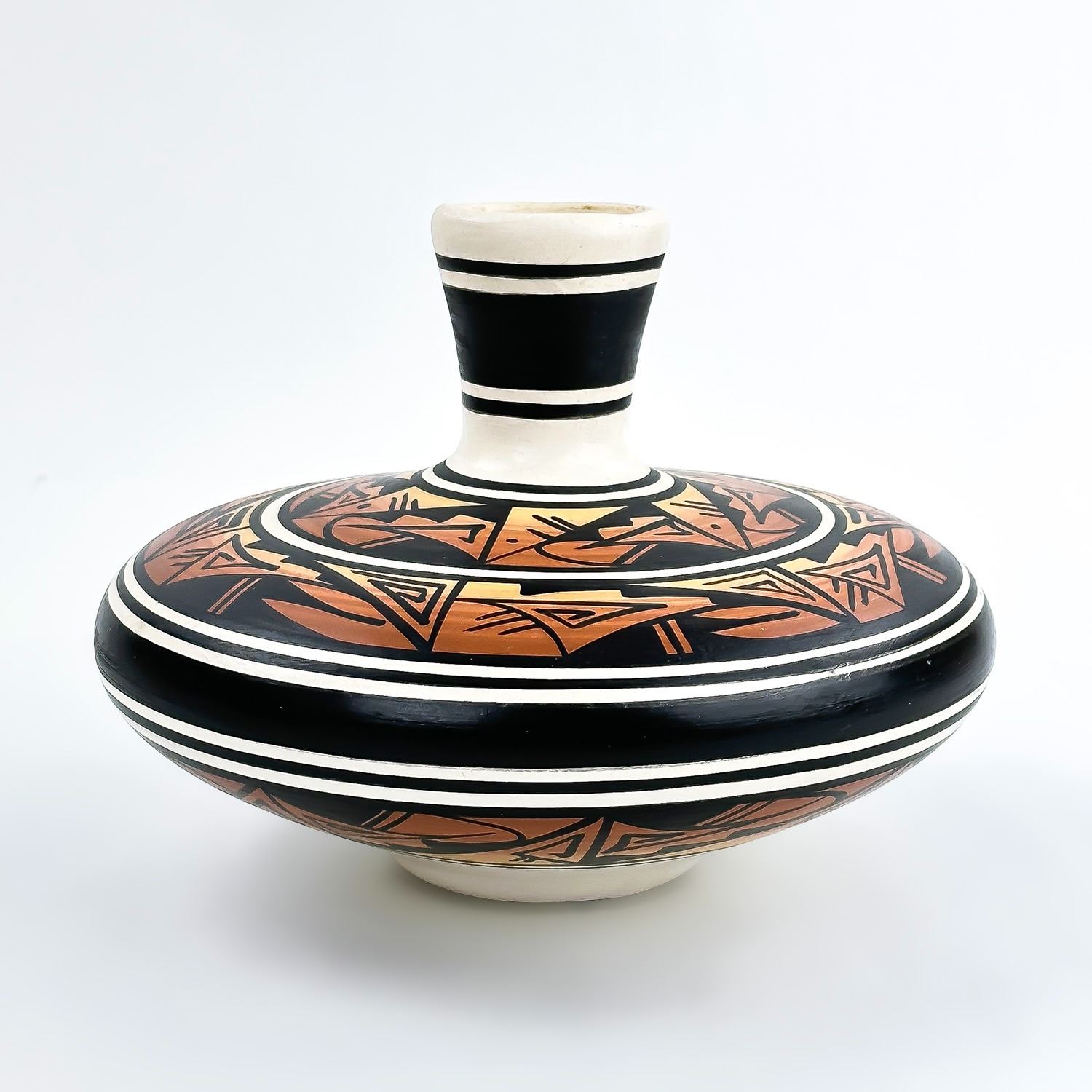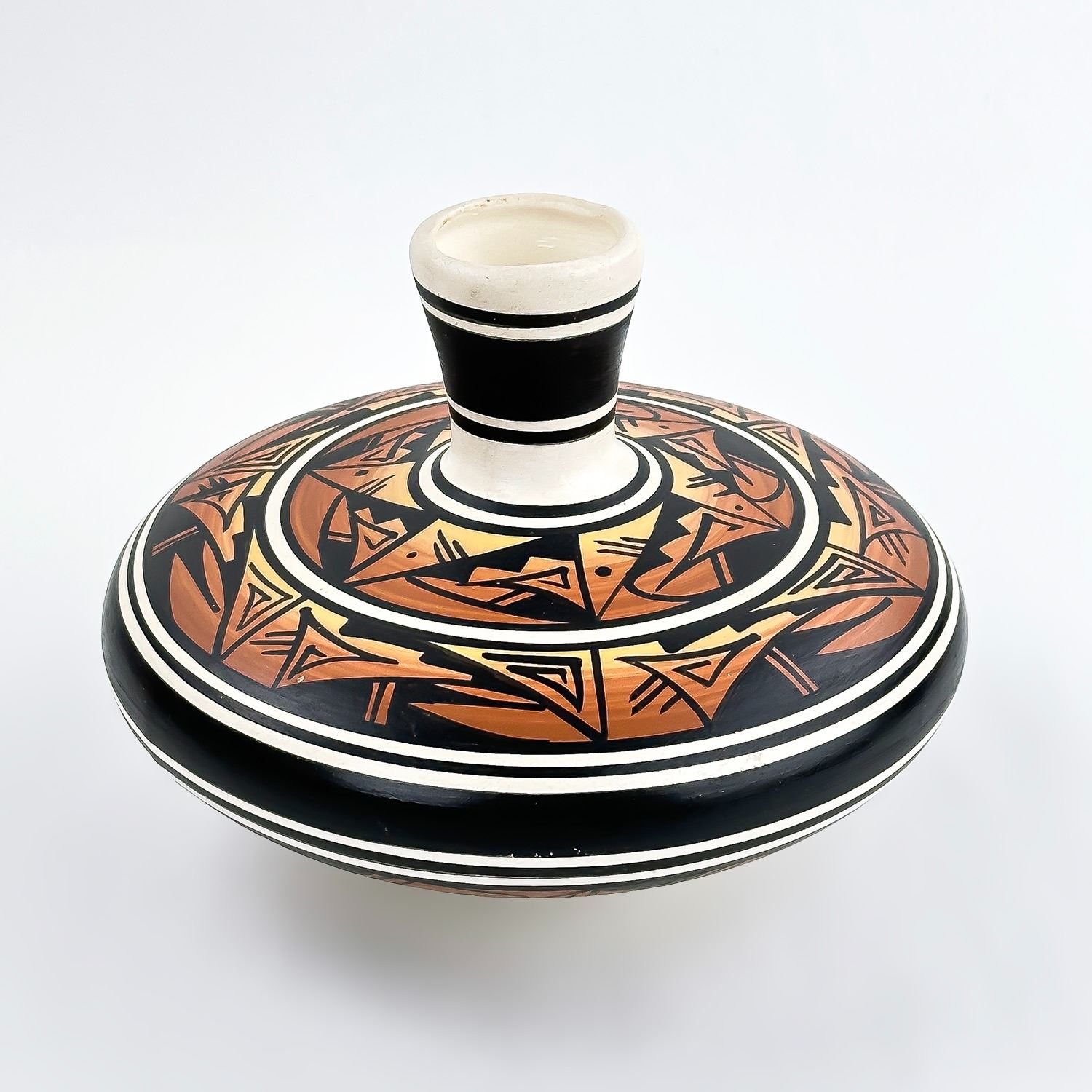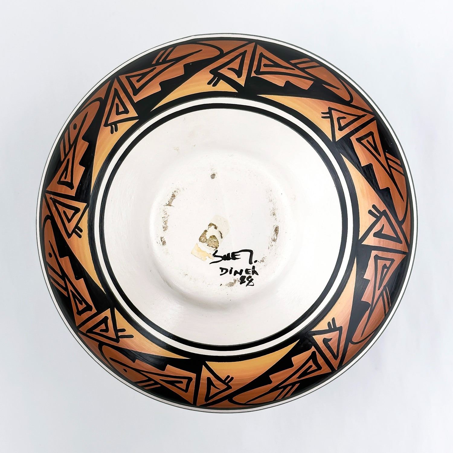 #8002 - NATIVE AMERICAN NAVAJO POTERY VASE BY SUE T DINE 1988. MEASURES: 5.5” (14 CM) TALL BY 7.75” (19.5 CM) WIDEST DIAMETER