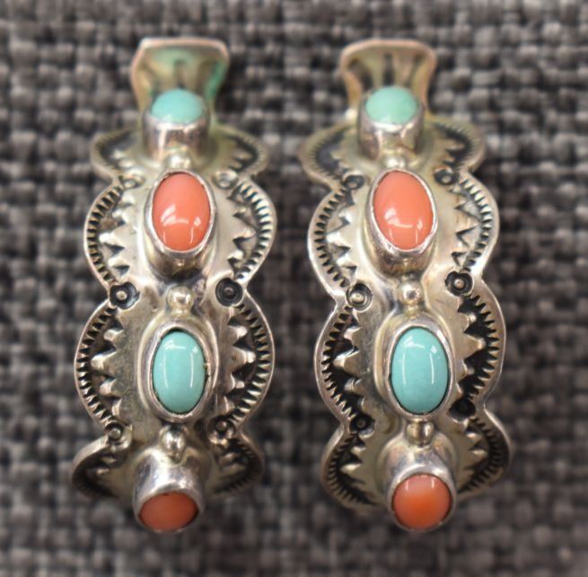 1990-2000's Navajo, sterling silver stamped design with turquoise and shell signed Rudy Willie 1.25" x .5" total weight 11 grams