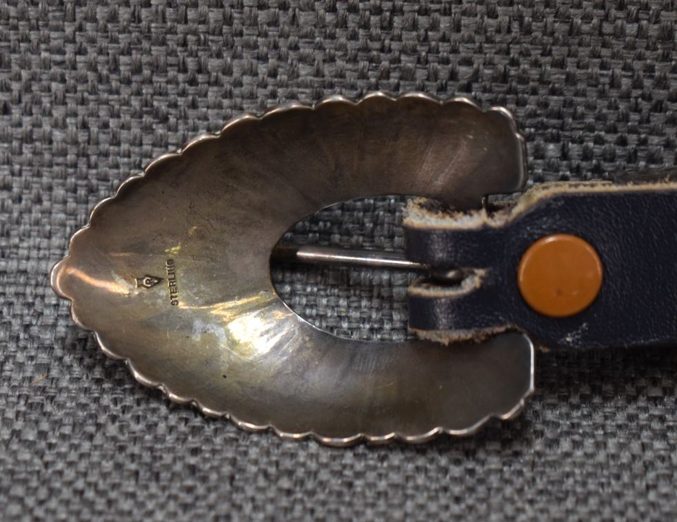 1980-90's Navajo Indian loom beaded on leather over commercial leather belt with sterling silver stamped design ranger buckle set signed with hallmark belt 46" long