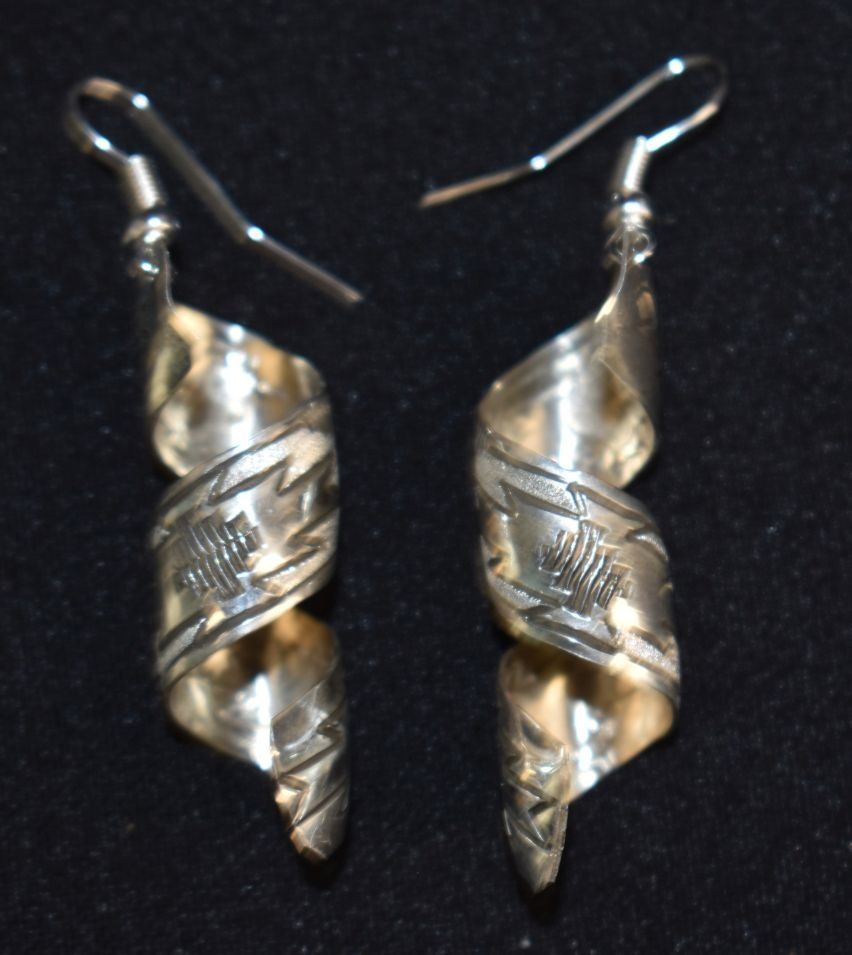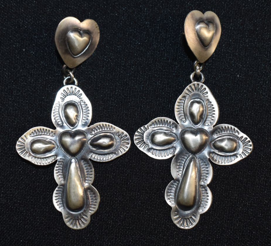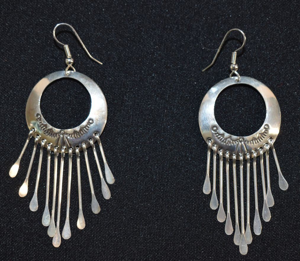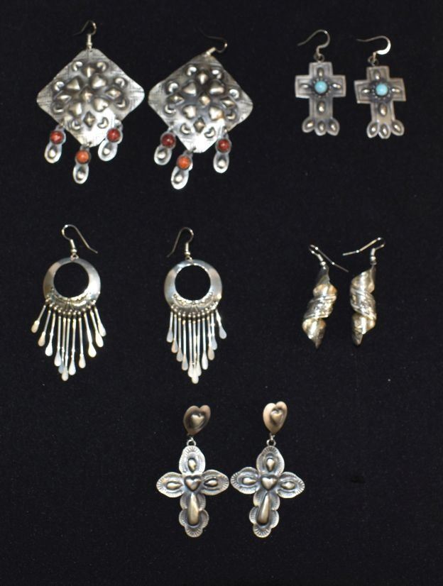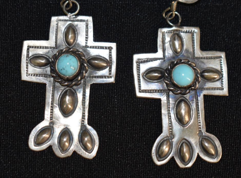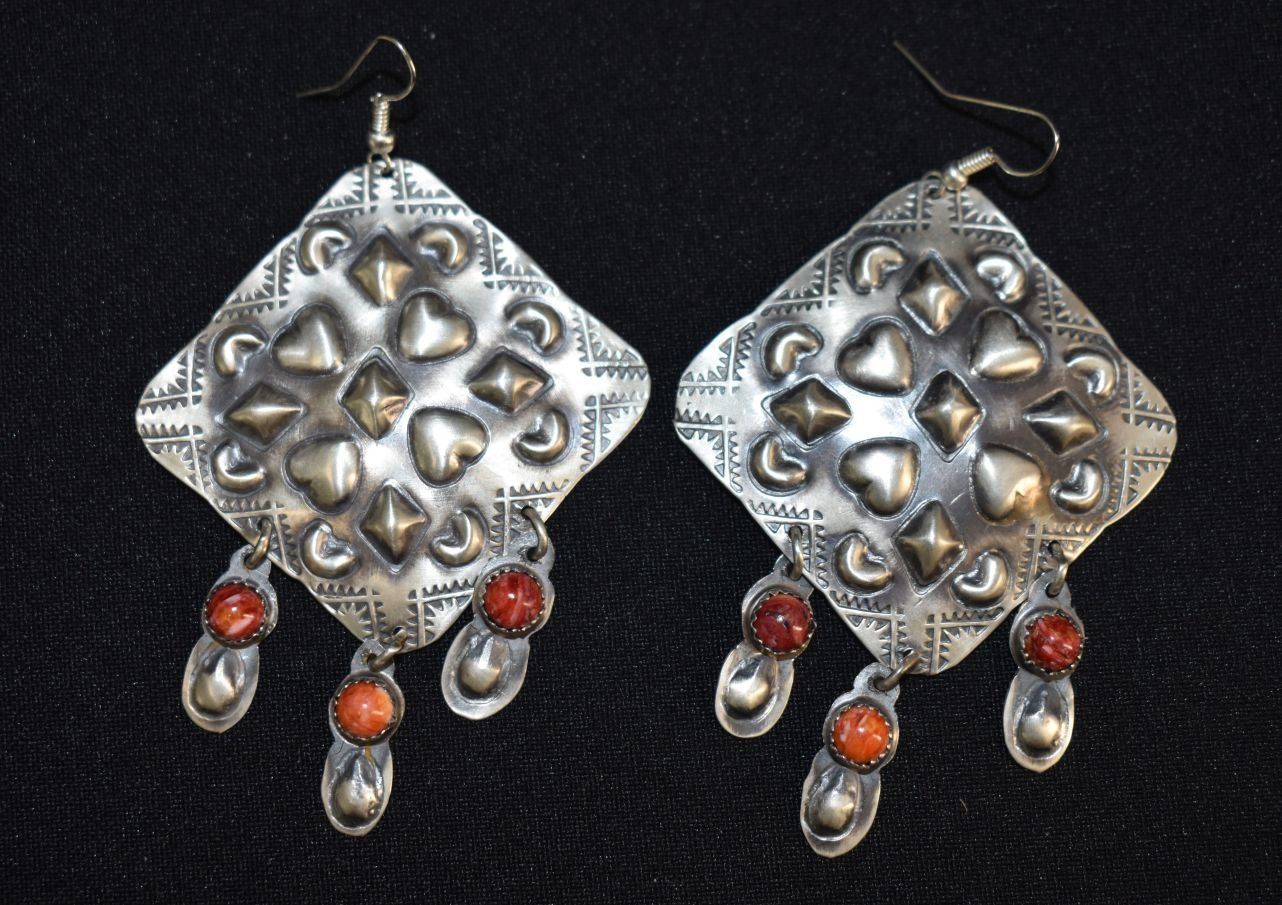 1990's Navajo Indian. Sterling silver turquoise and coral earrings, 3.5'' x 2'' largest pair