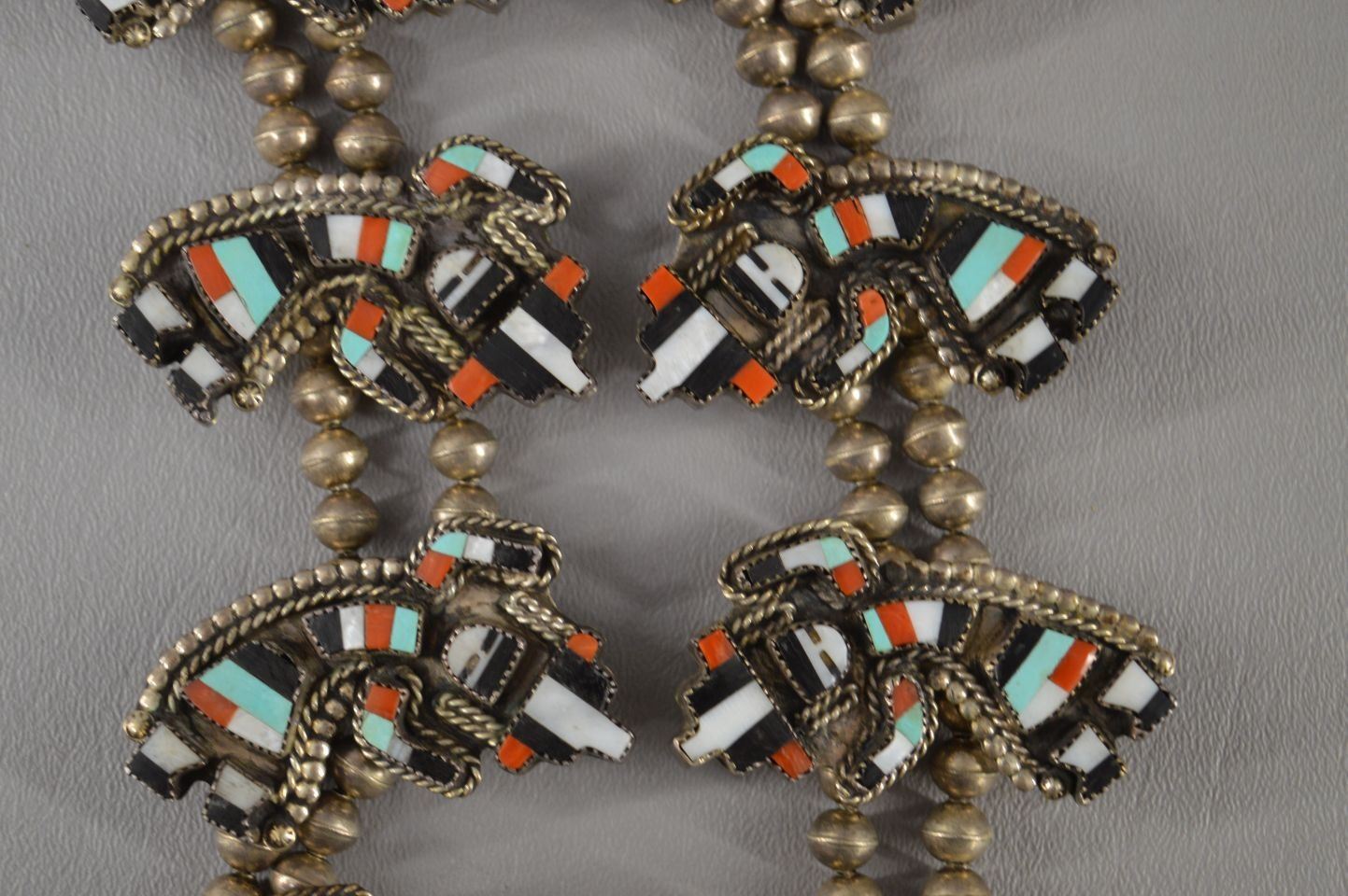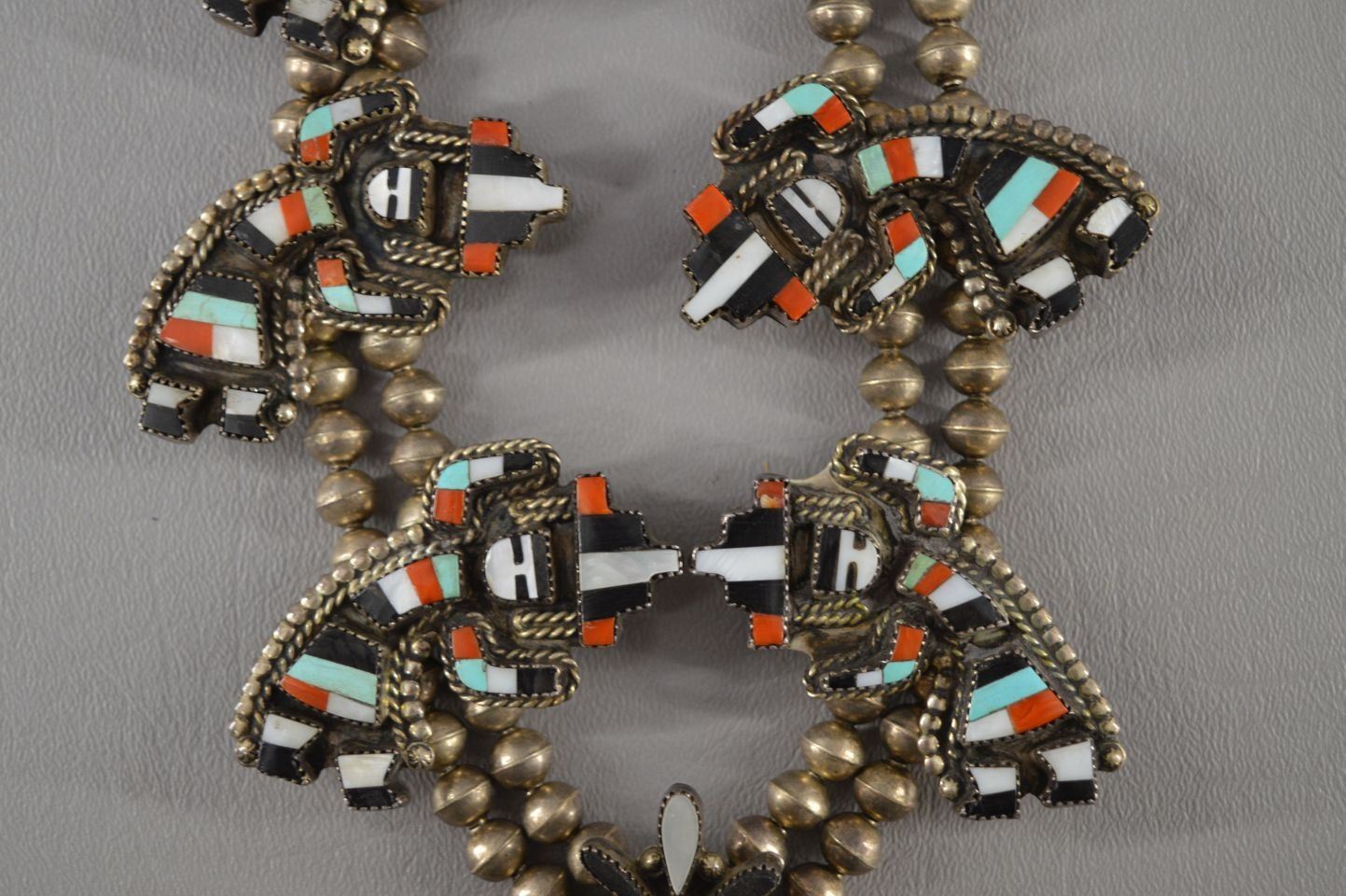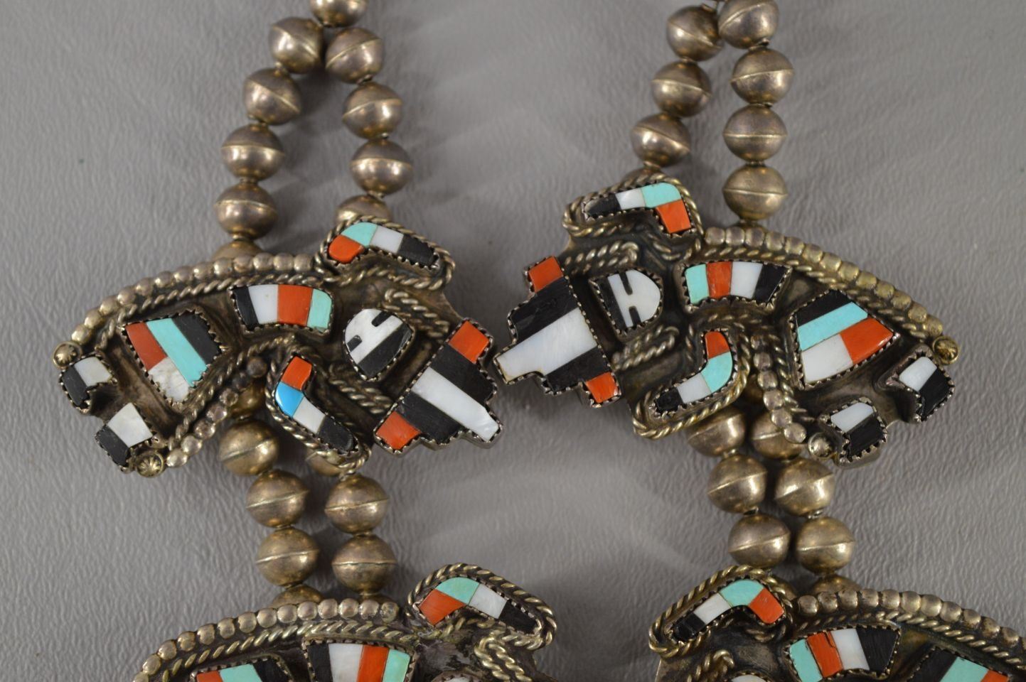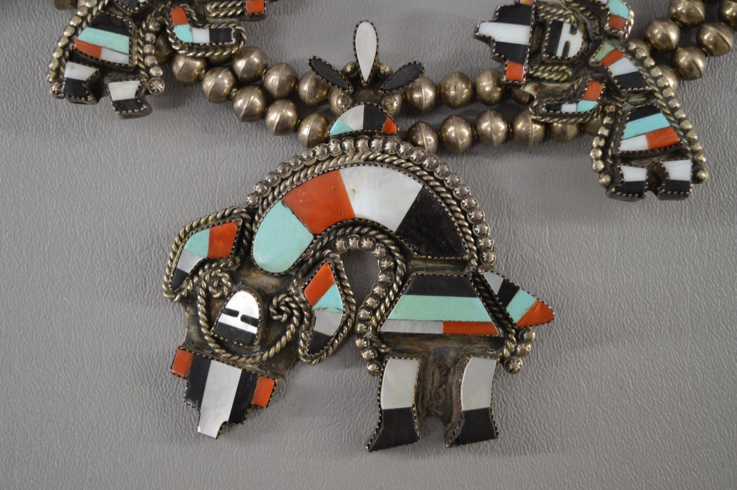 1980's Navajo Indian, sterling silver bead necklace 28'' long, ten sterling turquoise and shell bent rainbow gods,1.25'' x 2.25'' and matching Naja signed G.BRN,3.5'' x 3'' total weight 300 grams