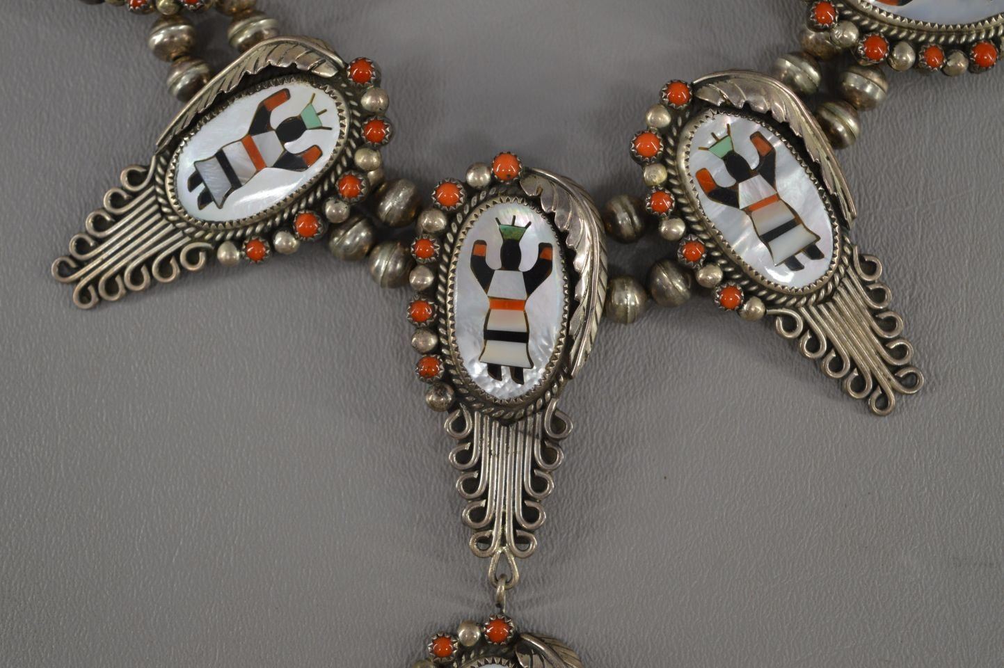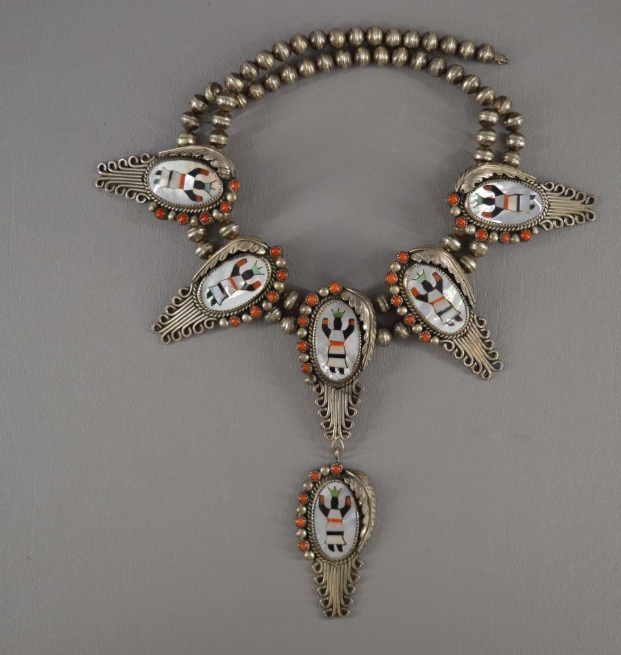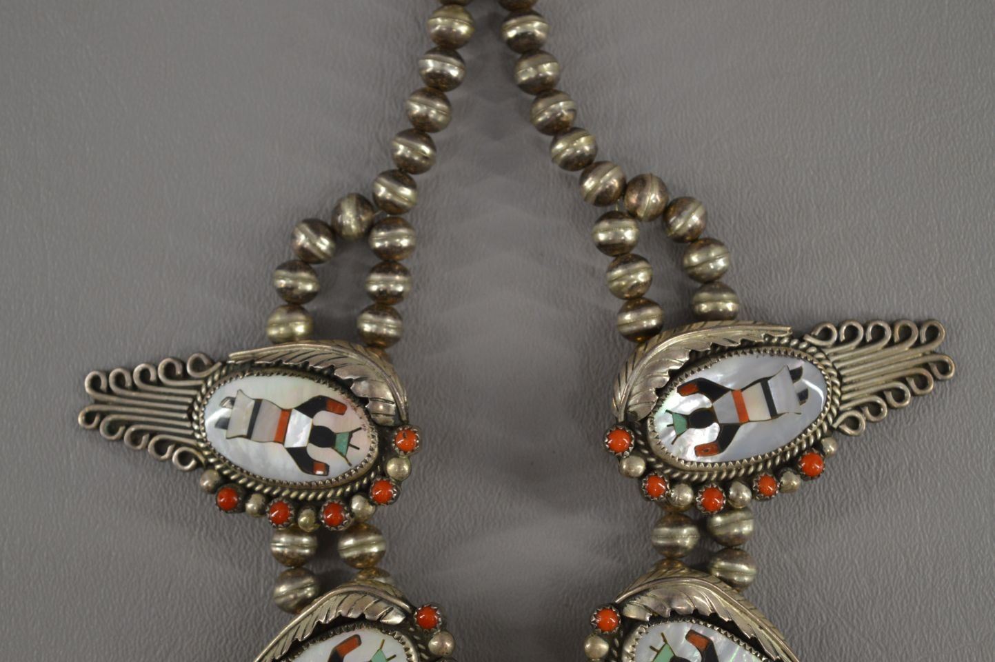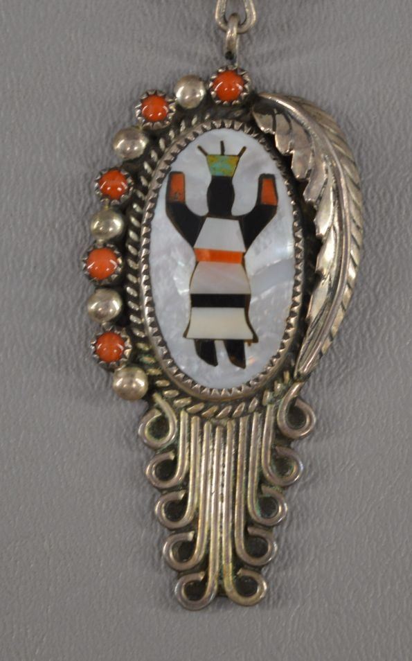 1970's Navajo Indian sterling silver with inlaid Gan dancer design 2.5" x 1.25" total length 21" total weight 133 grams