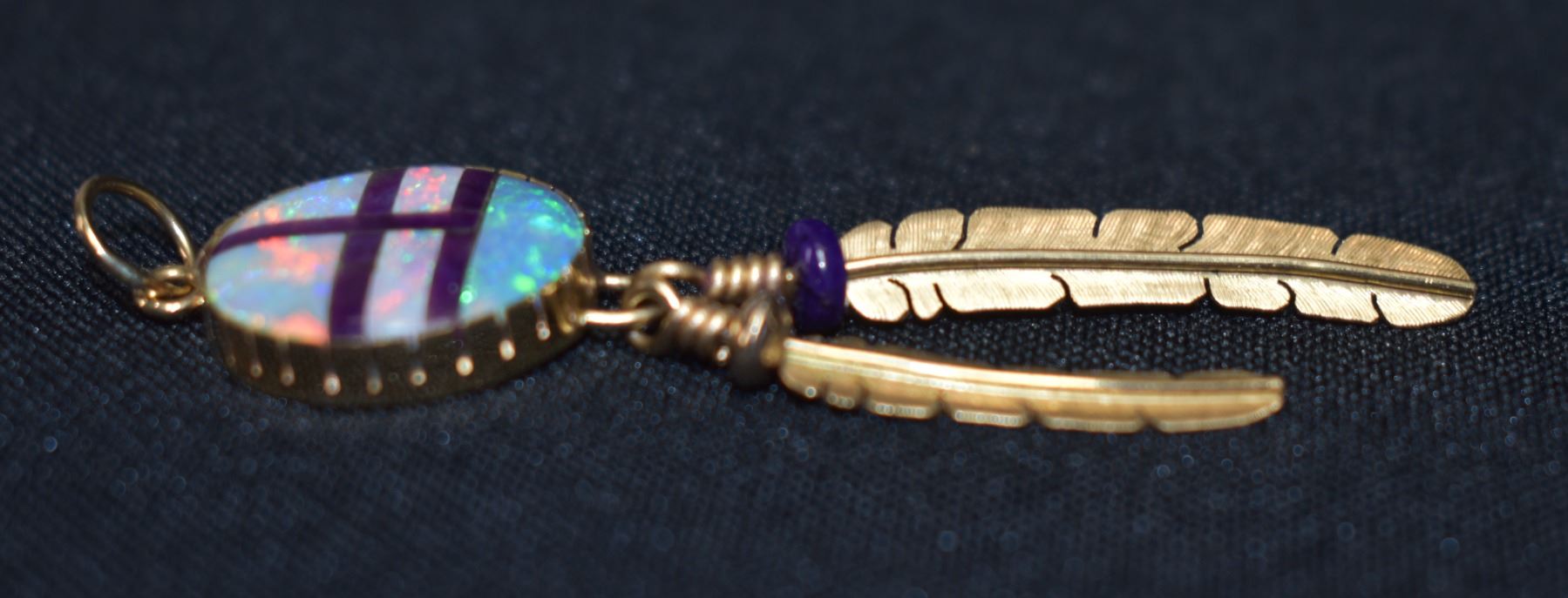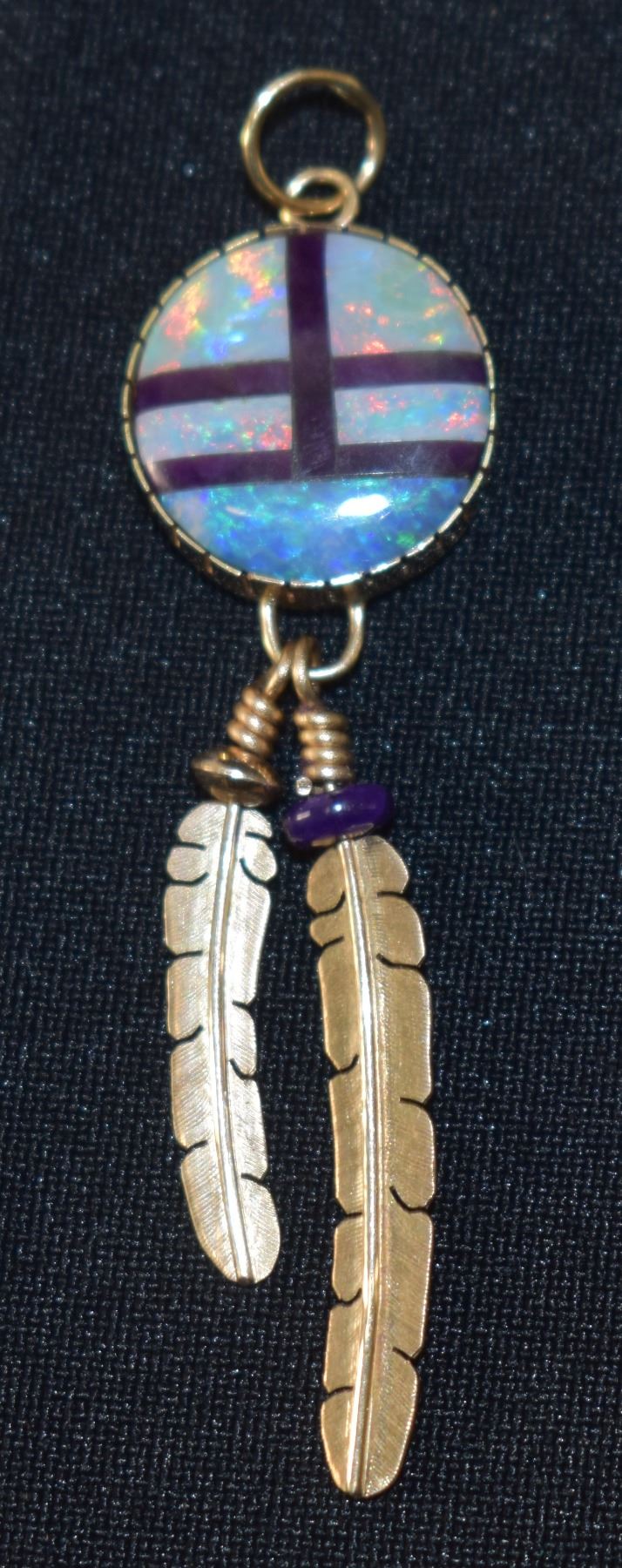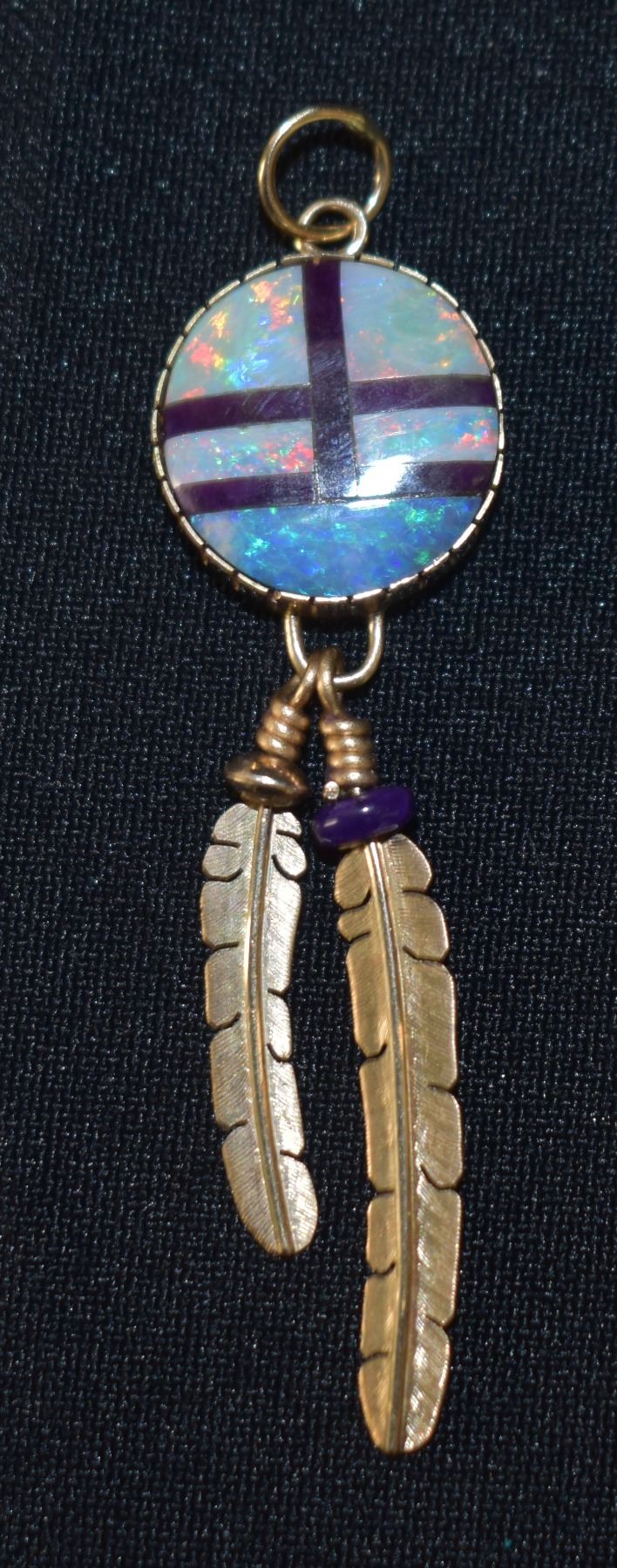 1980's Navajo Indian. 14k gold and opal pendant signed Kirk. 2.25'' x .75'' total weight 5 grams