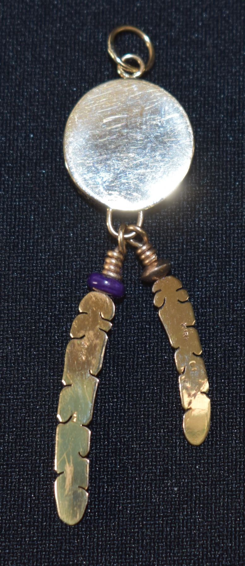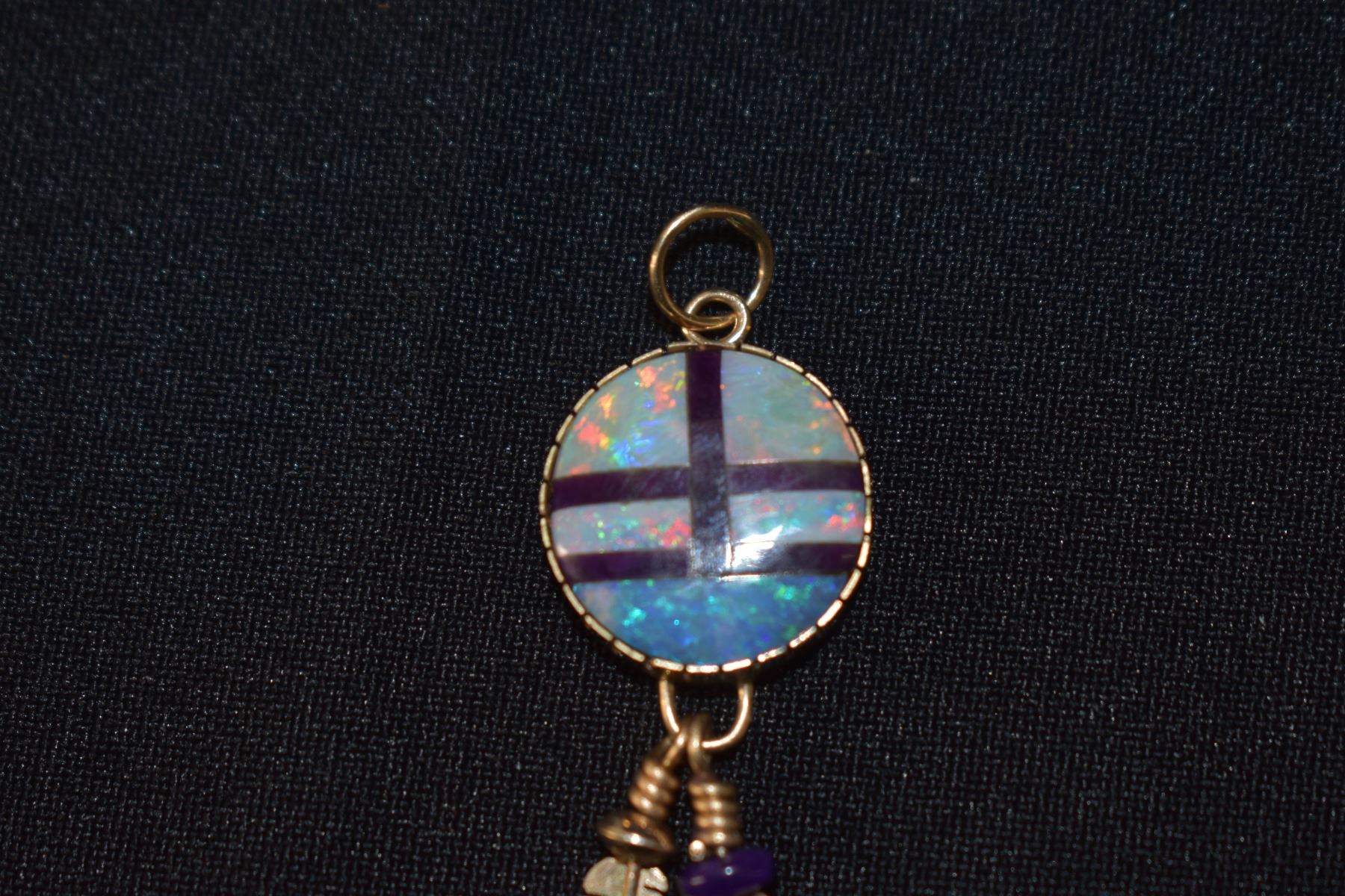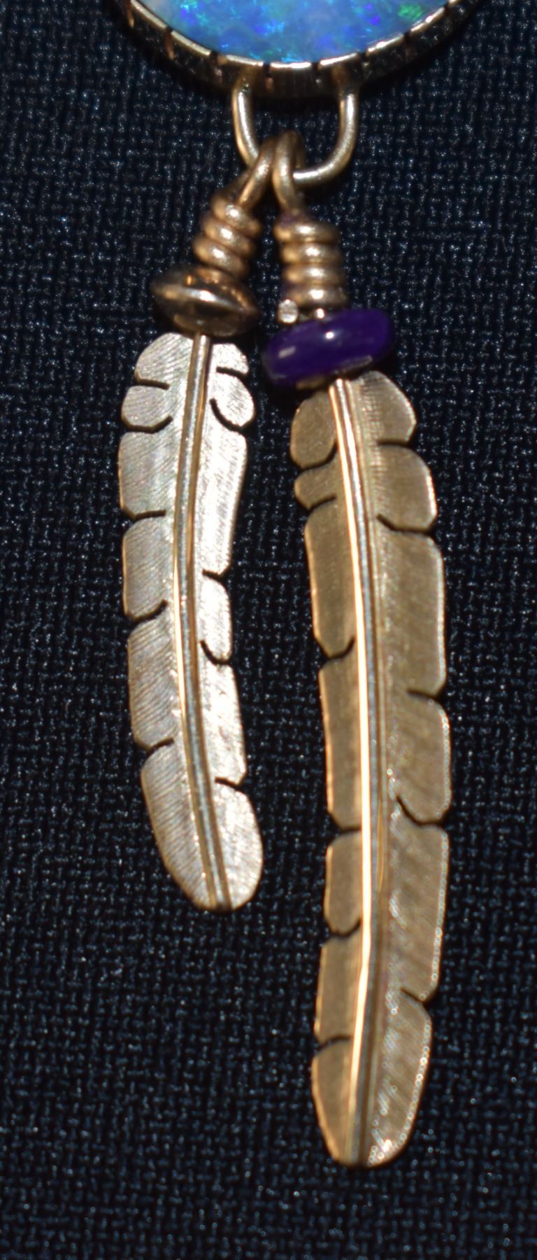 1980's Navajo Indian. 14k gold and opal pendant signed Kirk. 2.25'' x .75'' total weight 5 grams