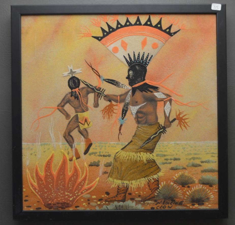 1990's Navajo Indian, original sand painting depicting Apache spirt dancers, signed Medicine Crow. 17'' x 17''