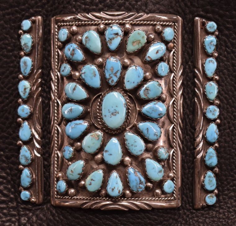 1960-70's Navajo Indian, sterling silver and turquoise 3.75" x 2.75" total weight 197 grams including leather