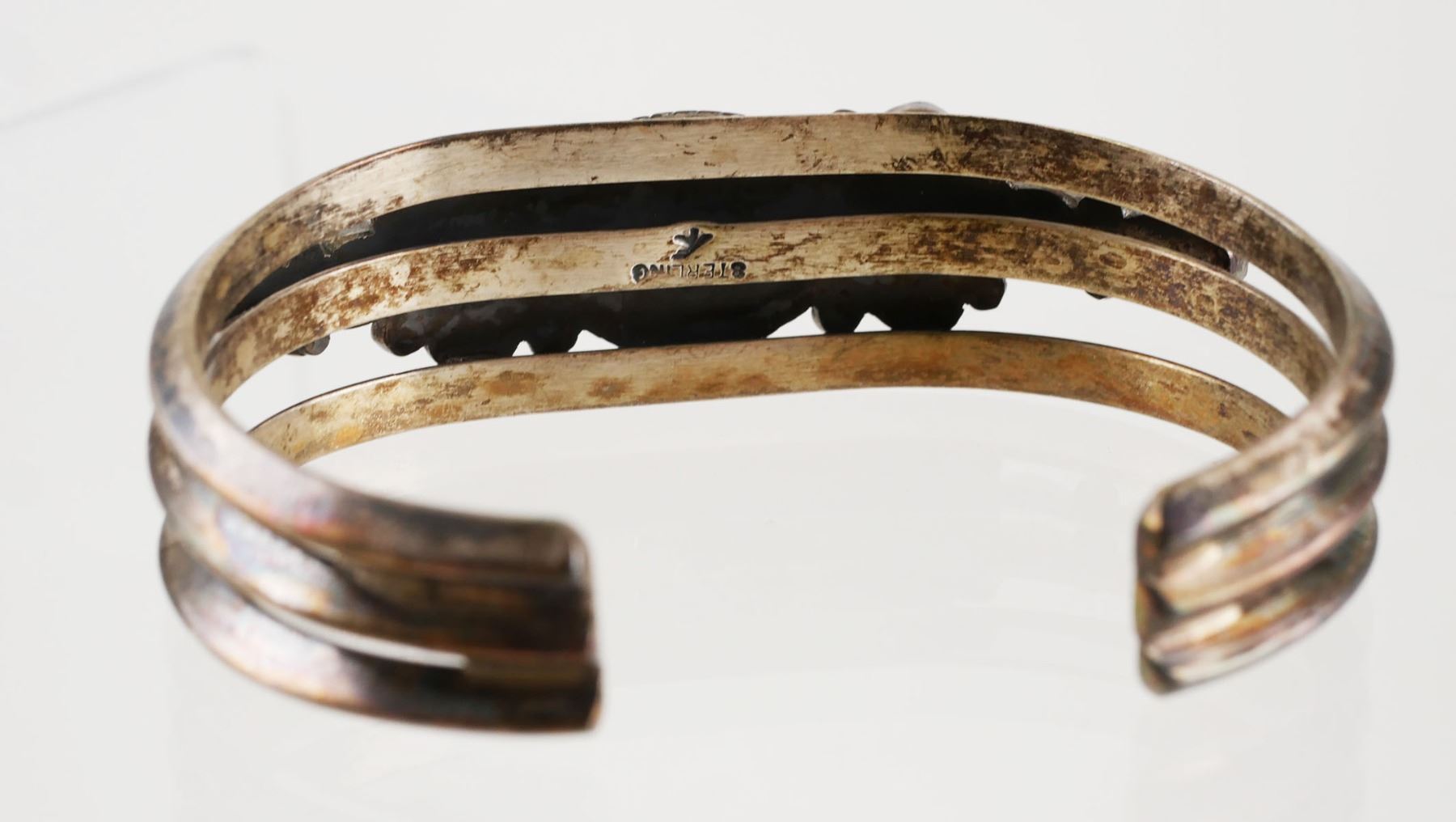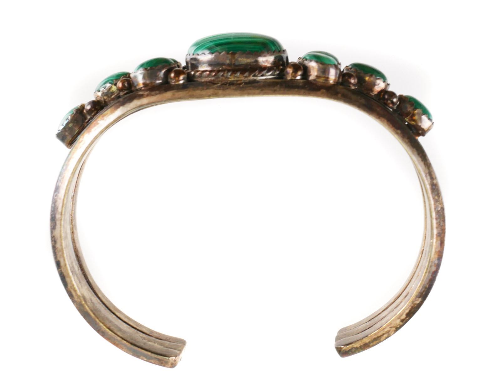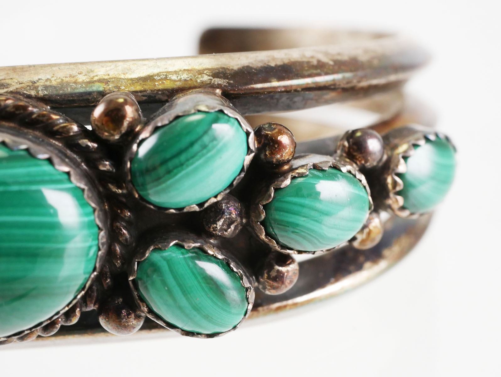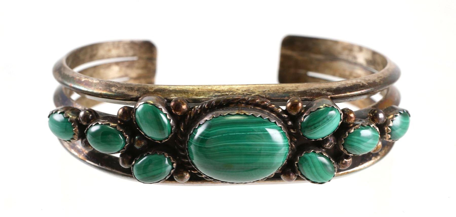 Native American Indian hand crafted sterling silver & malachite cuff bracelet. Unidentified picto hallmark above the sterling mark. Opening gap is 1", inside circumference is approx. 6 1/2" including gap. Overall weight is 41.2 grams. Bracelet is in good condition with light wear & tarnish, see photos for more details on condition.