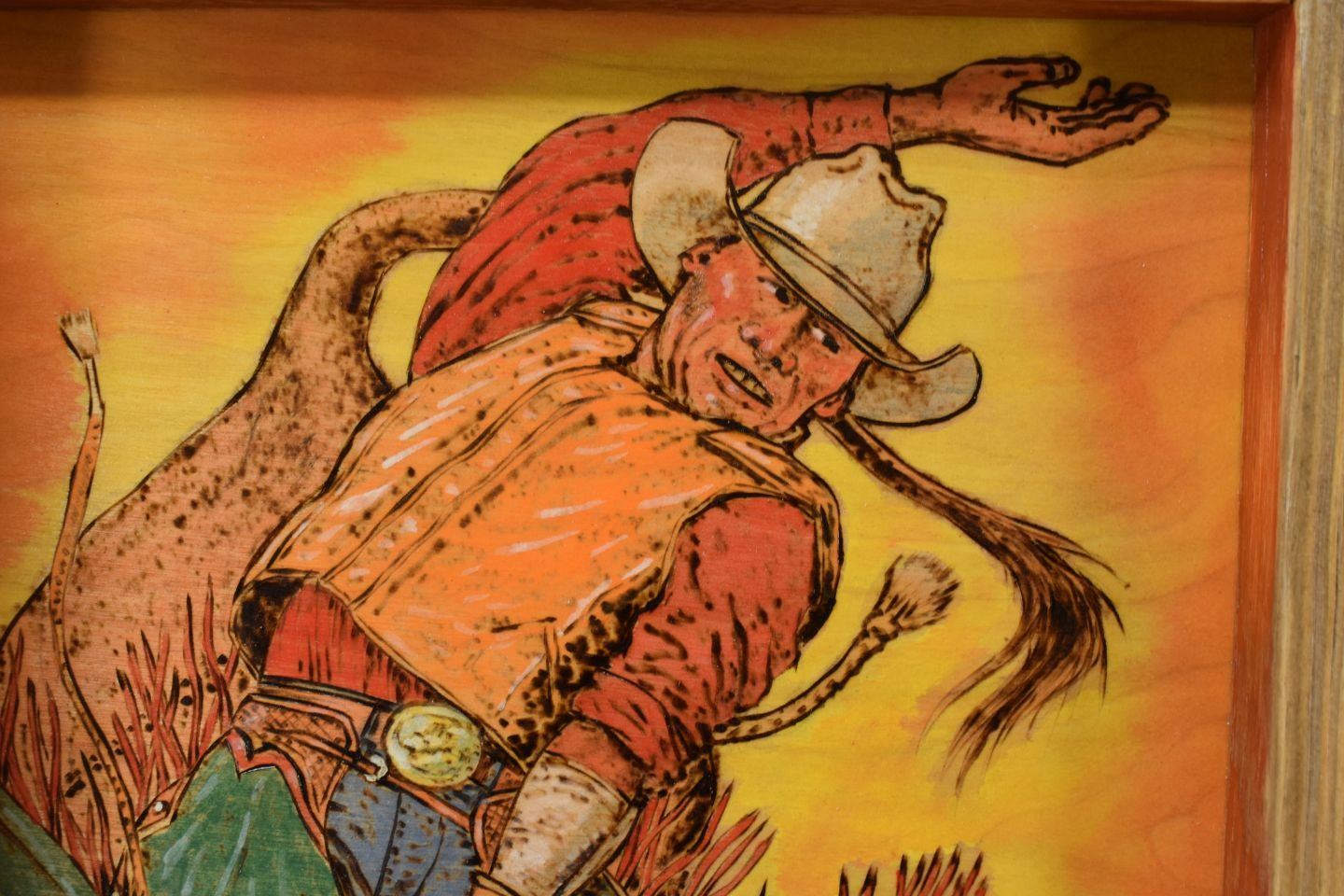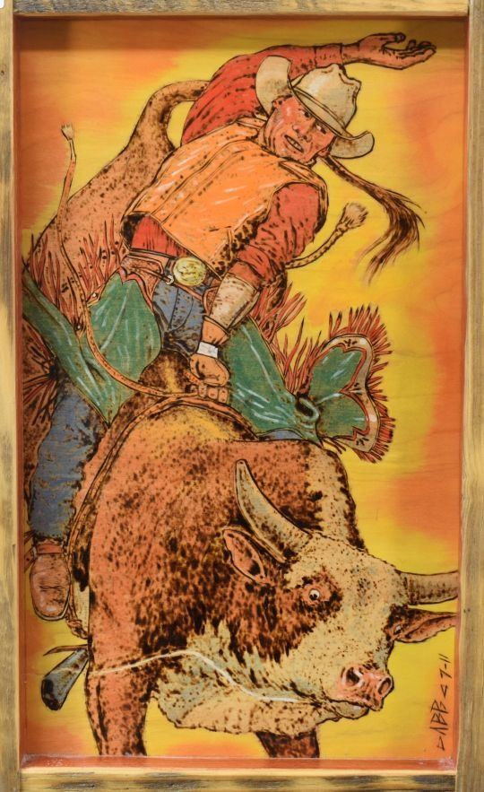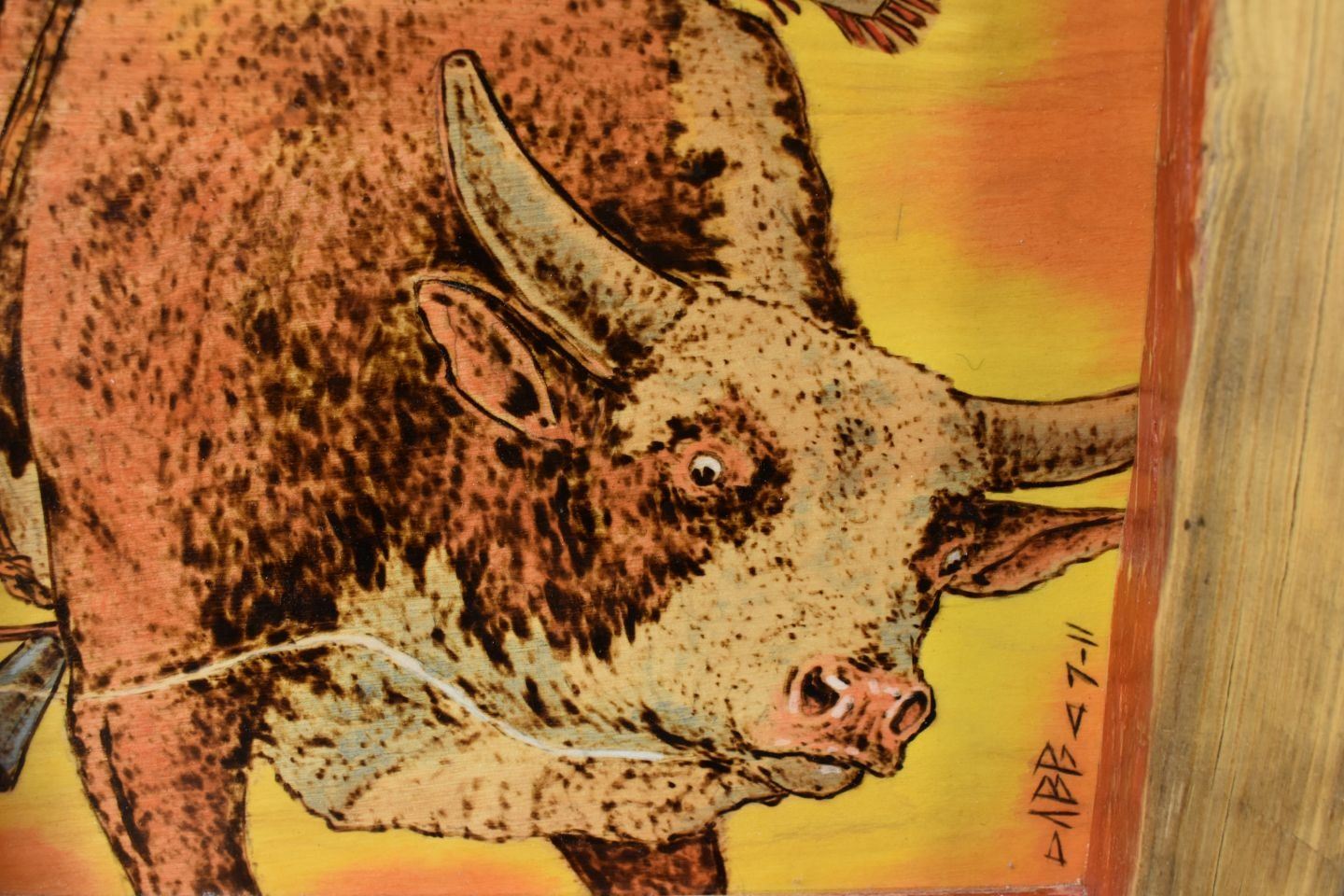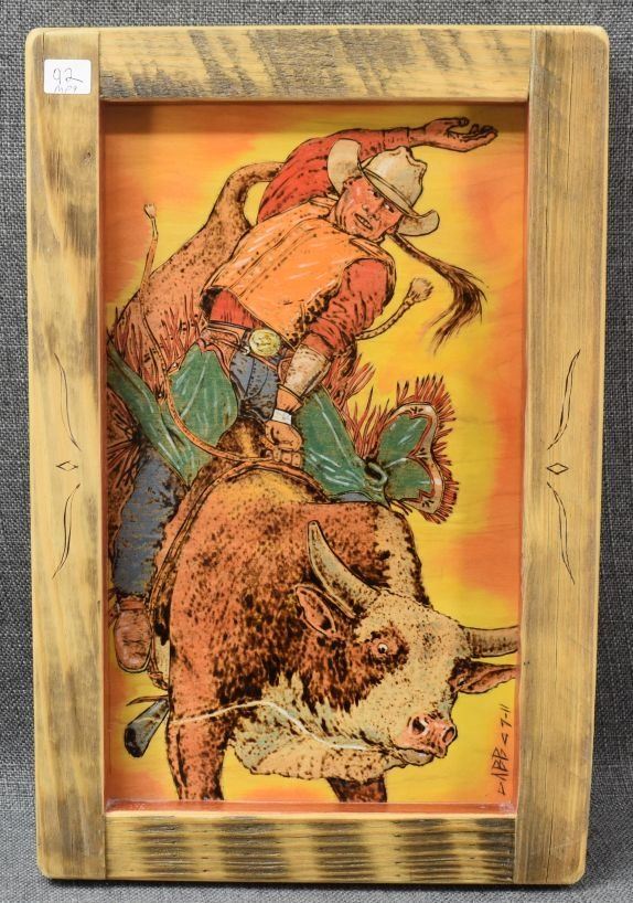 2011 Navajo, original hand painted on wood depicting bull rider signed ABB for Ambrose Begay 13.5" x 8" framed to 16.5" x 11"