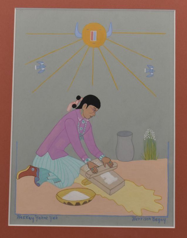 1970's Navajo, original hand painted watercolor on paper depicting woman grinding corn by Harrison Begay 8.5" x 6.25" matted and framed to 16" x 13.75"