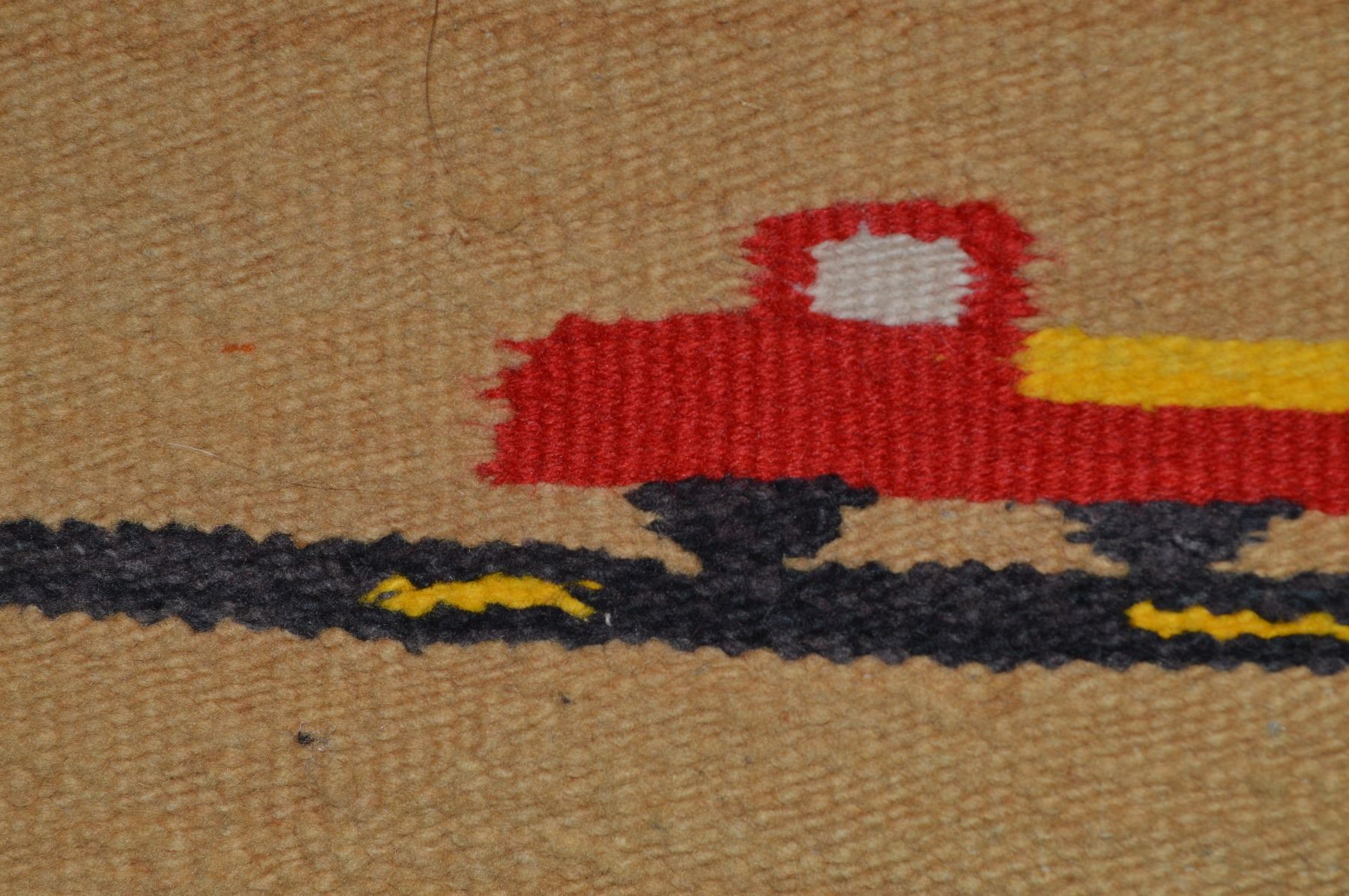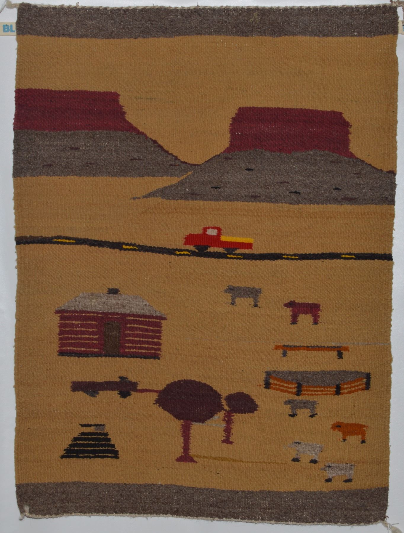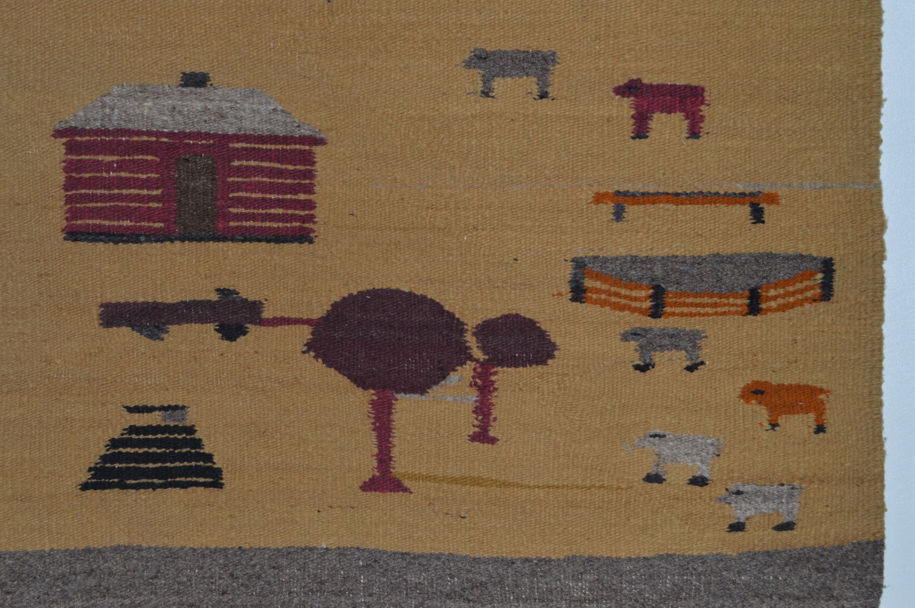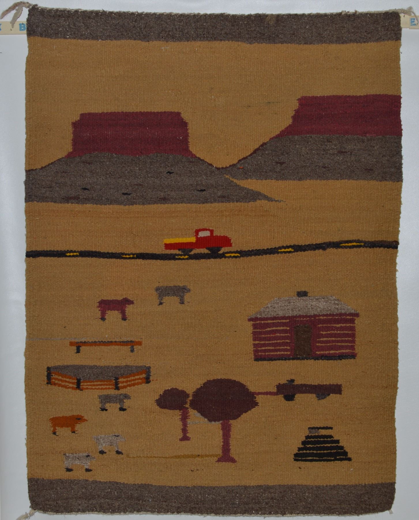 1970's. Hand woven Navajo homeland scene with goats, arena, and pickup truck.
