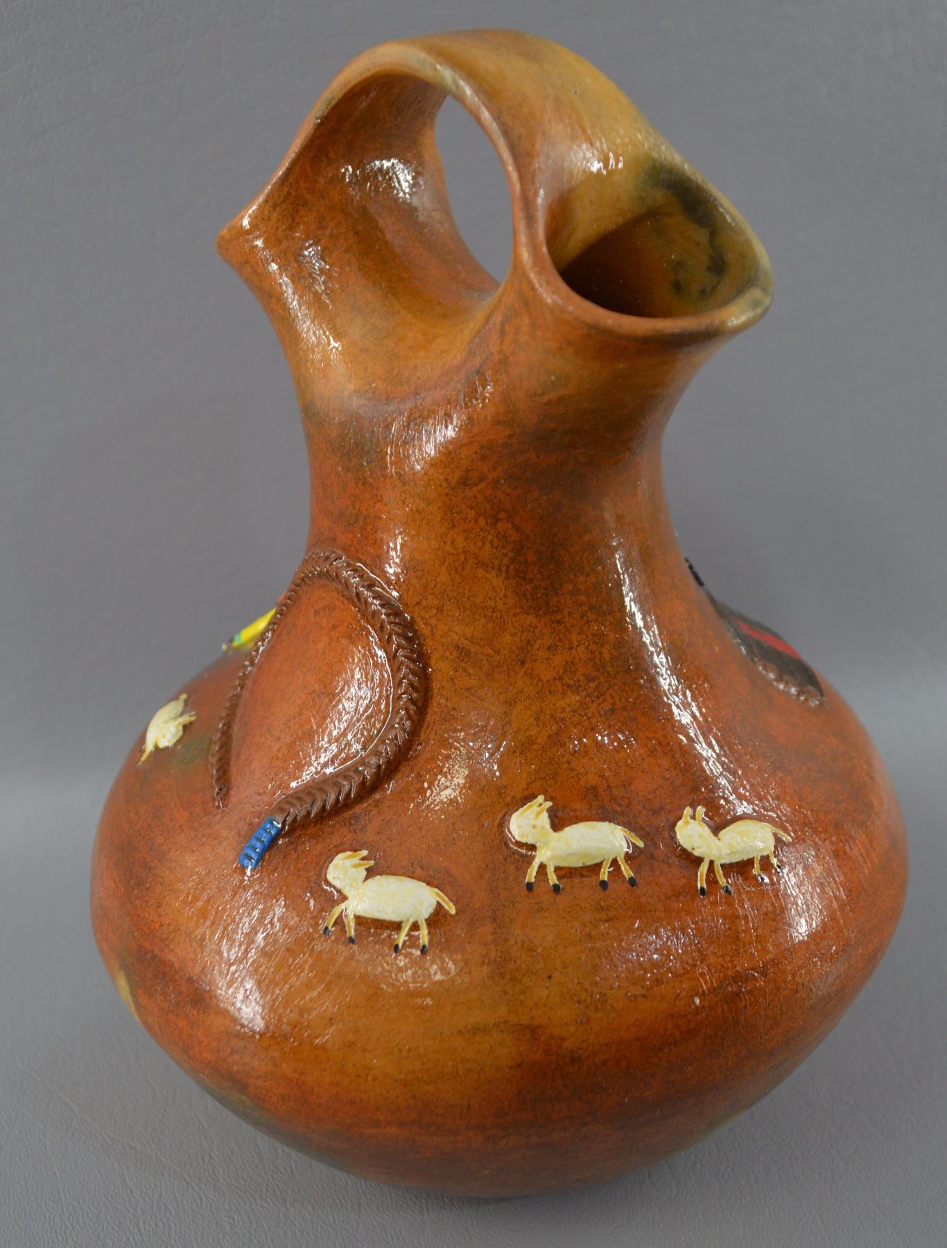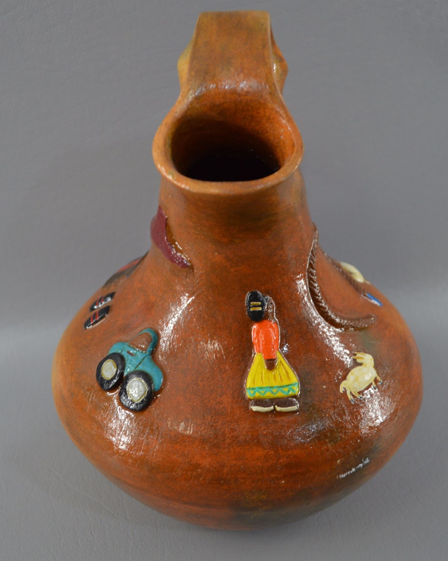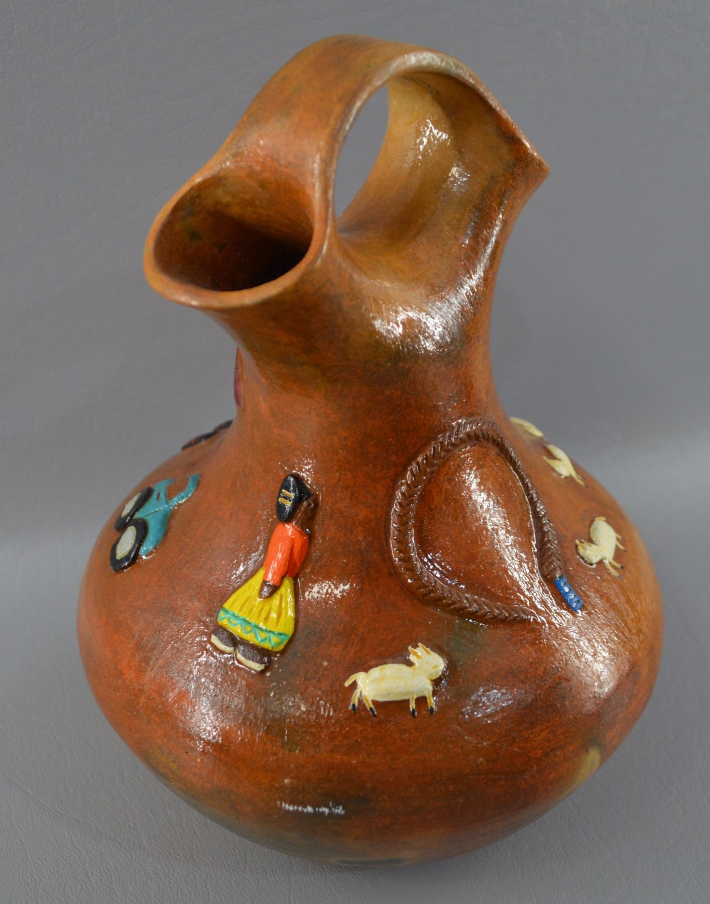 1980-90's. Hand made with raised sheep herder scene and painted design. Has cactus glaze. Signed RM.