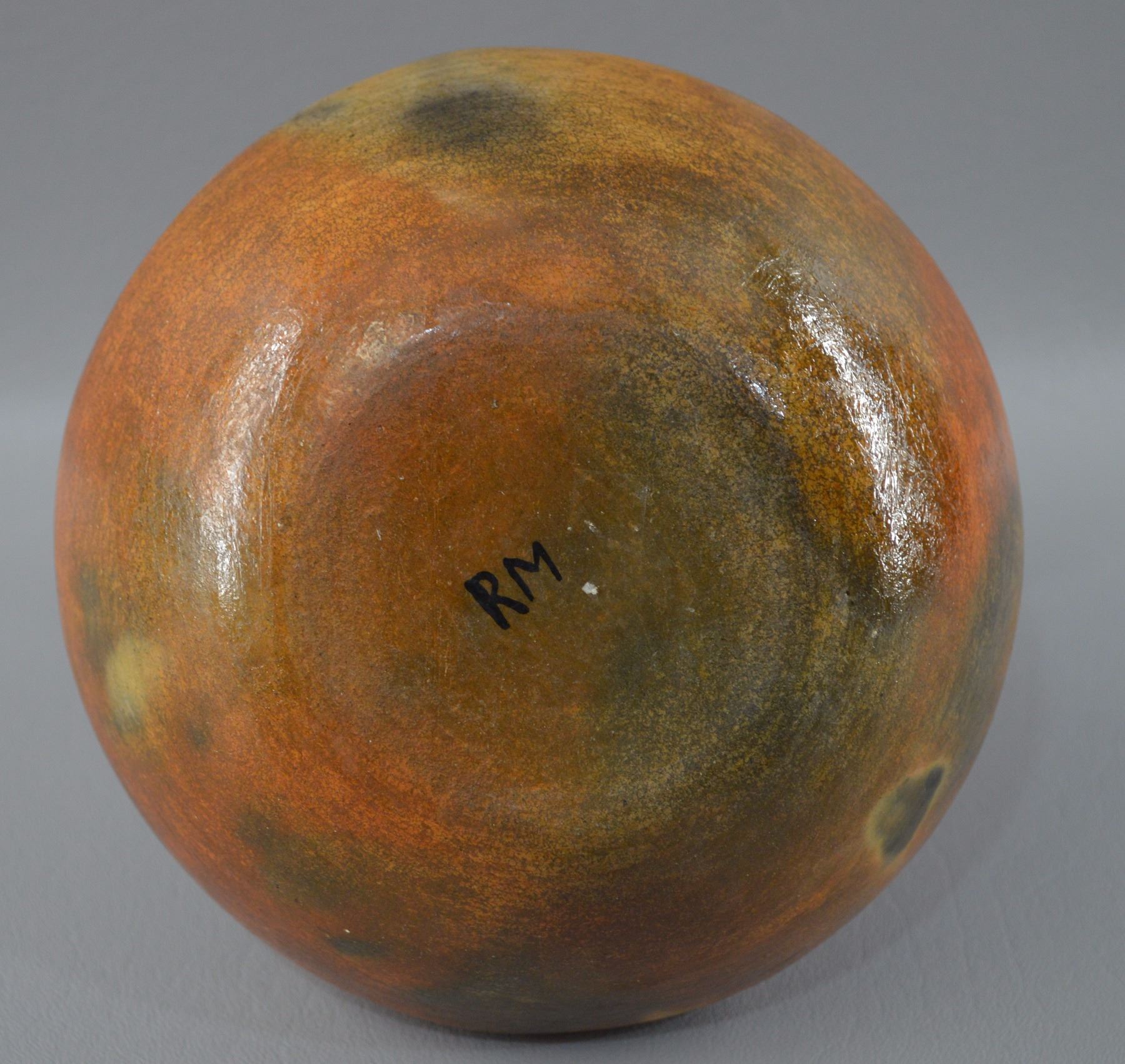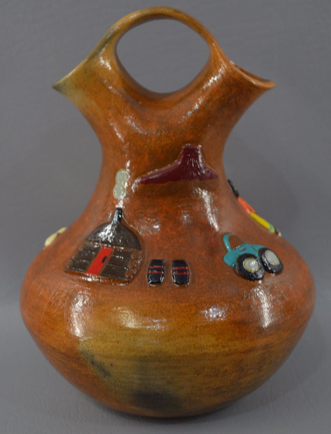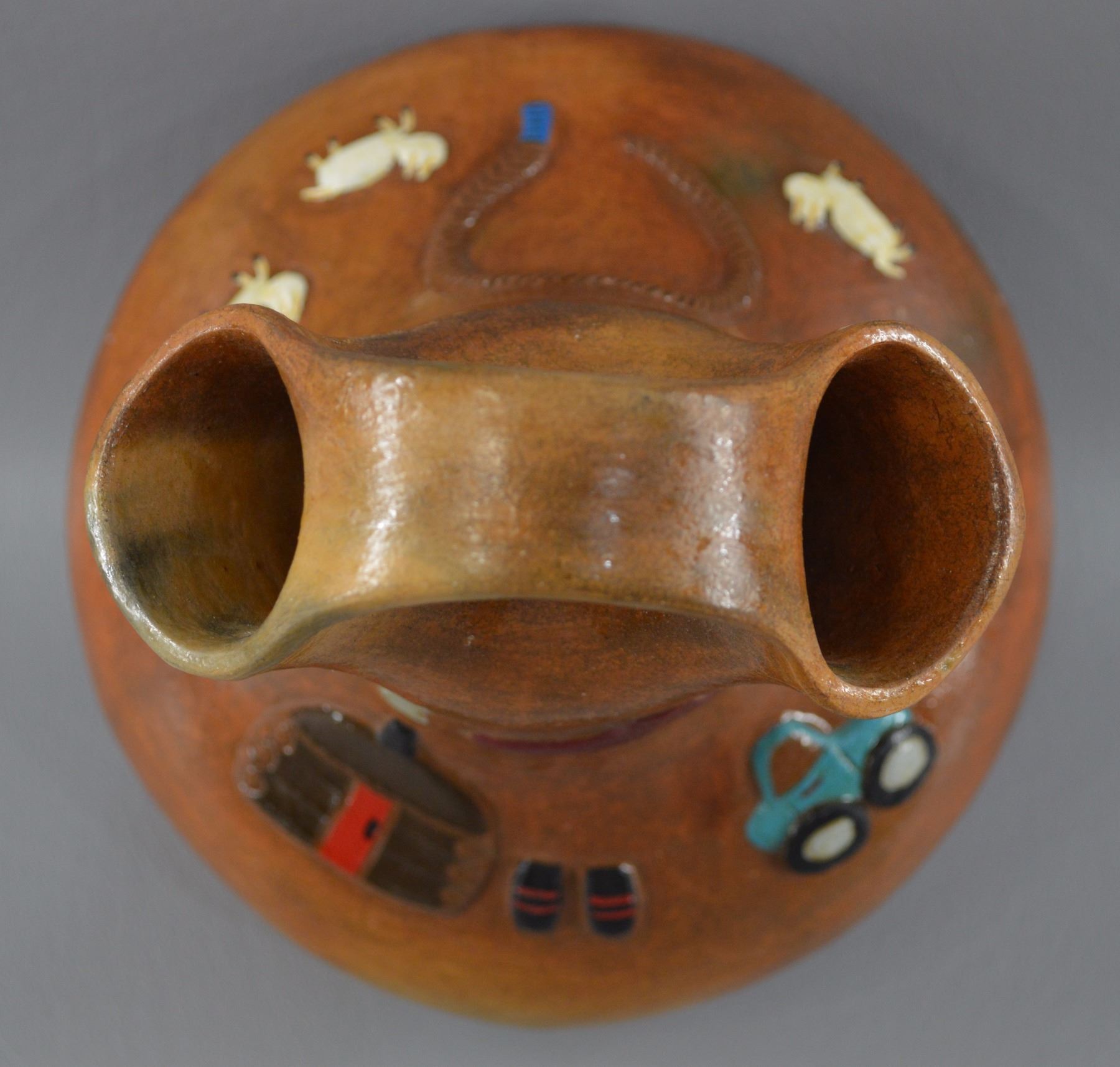 1980-90's. Hand made with raised sheep herder scene and painted design. Has cactus glaze. Signed RM.