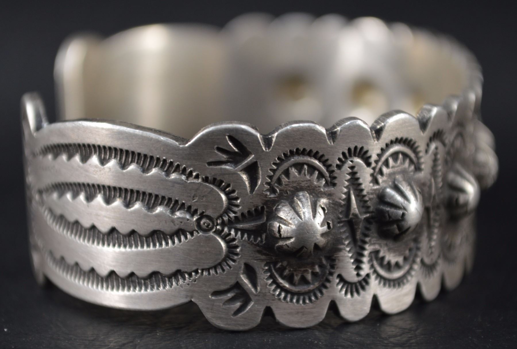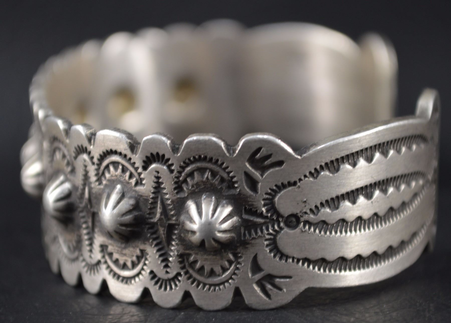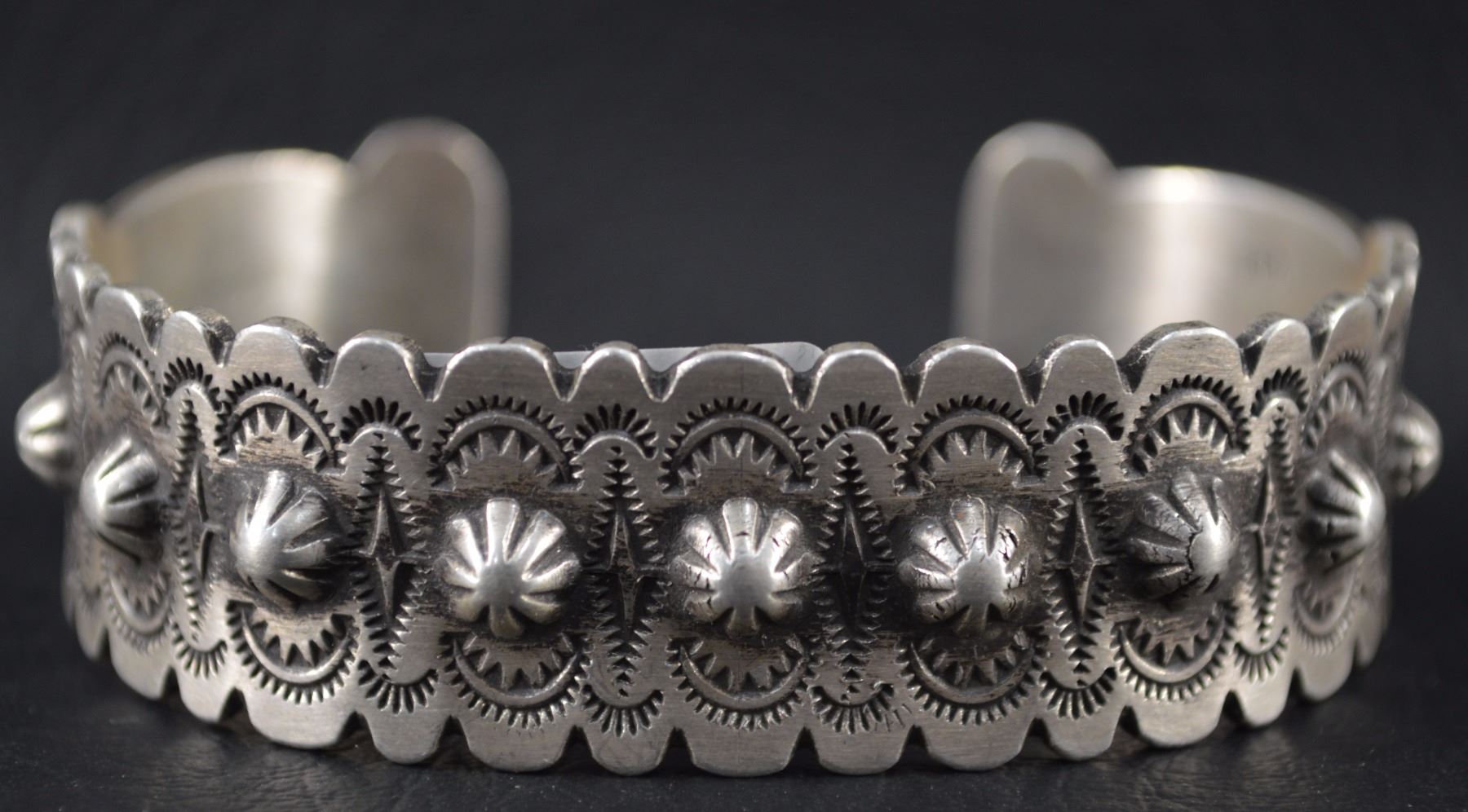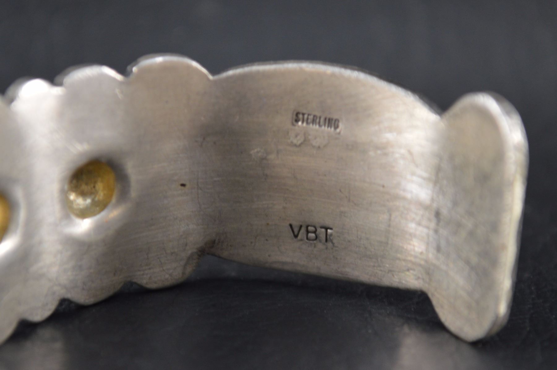 1990's. Sterling silver with hand stamped and bump out design. Signed VBT for Vernon Tracy.