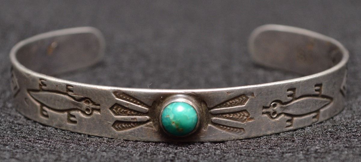 1950's. Ingot sterling silver with Fred Harvey style stamped design and turquoise stone. .25" x 5" x 1.25", .3 oz.