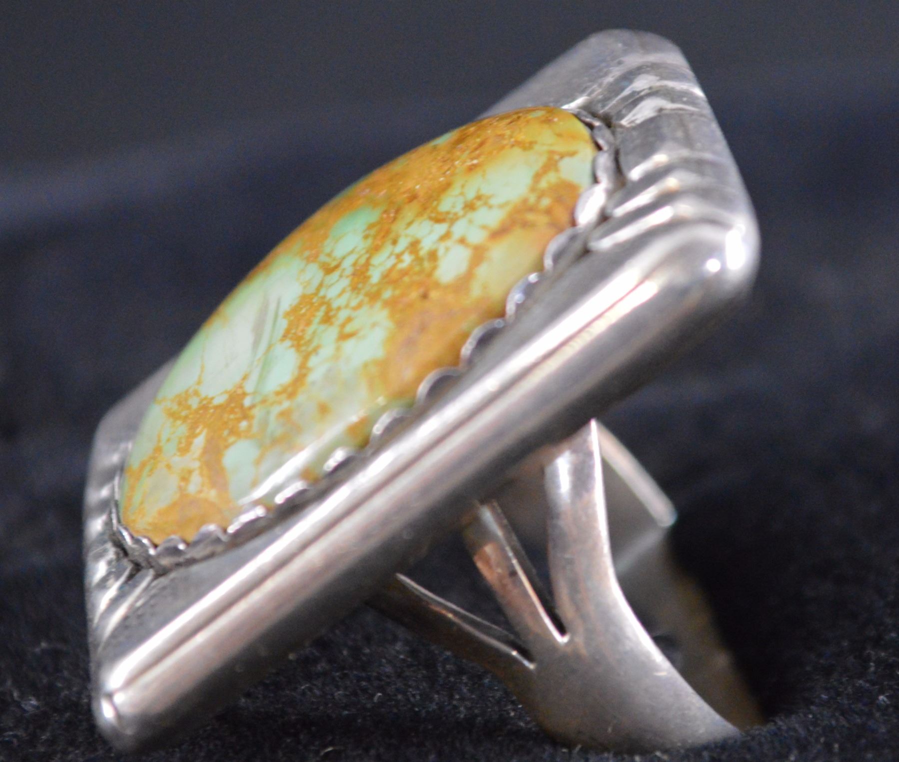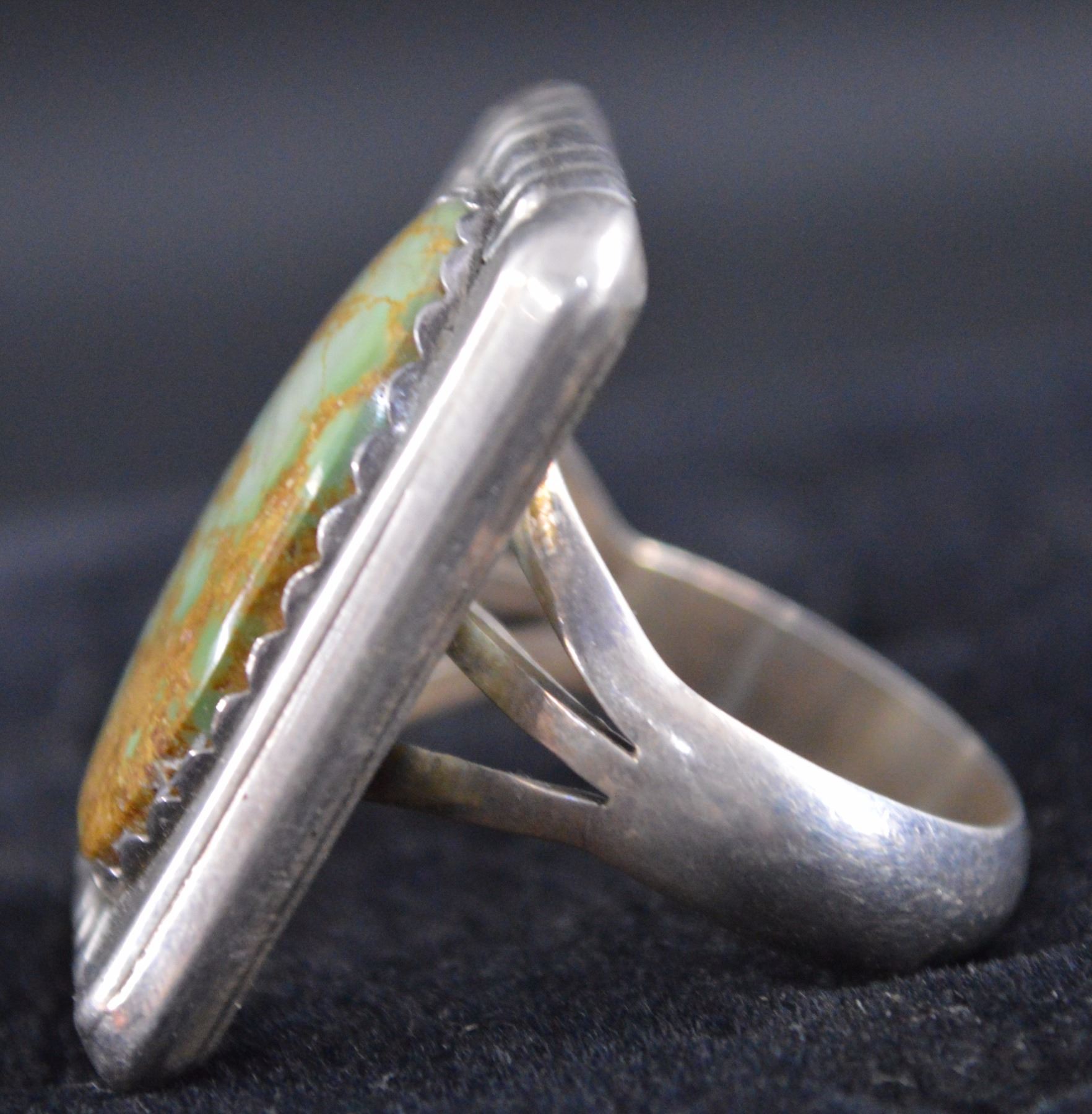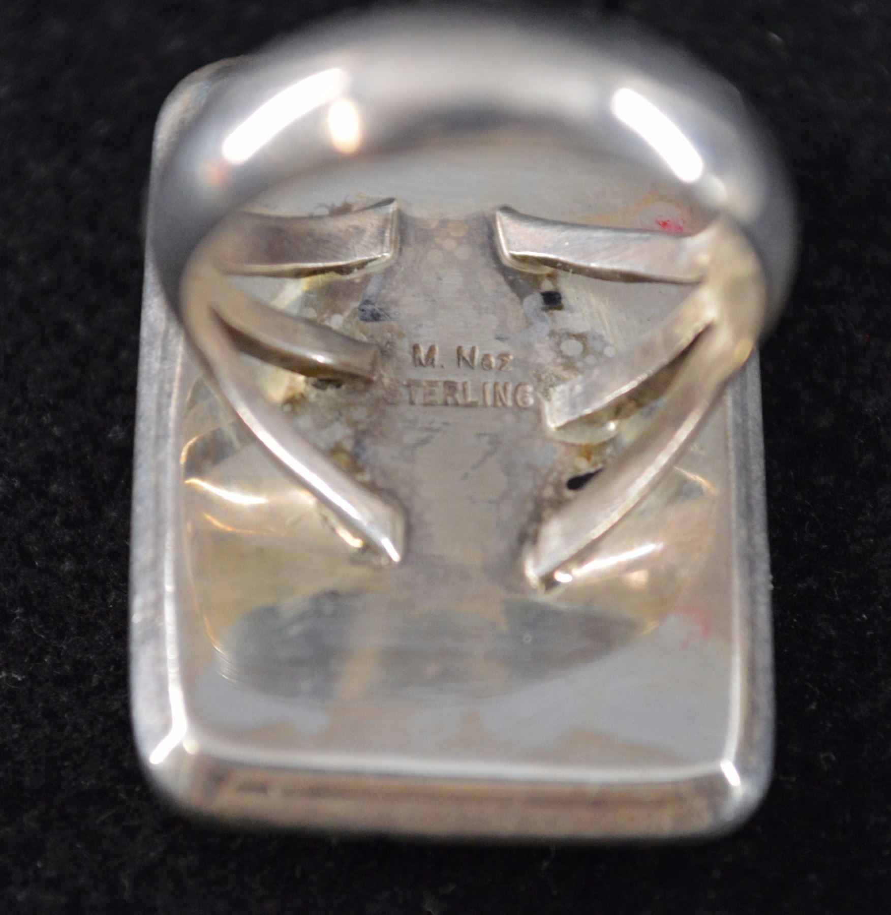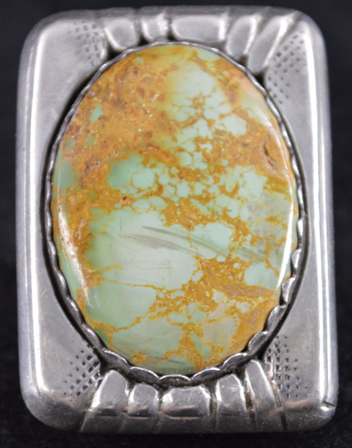1990's. Sterling silver hand stamped design with single turquoise stone. Signed L M Nez.