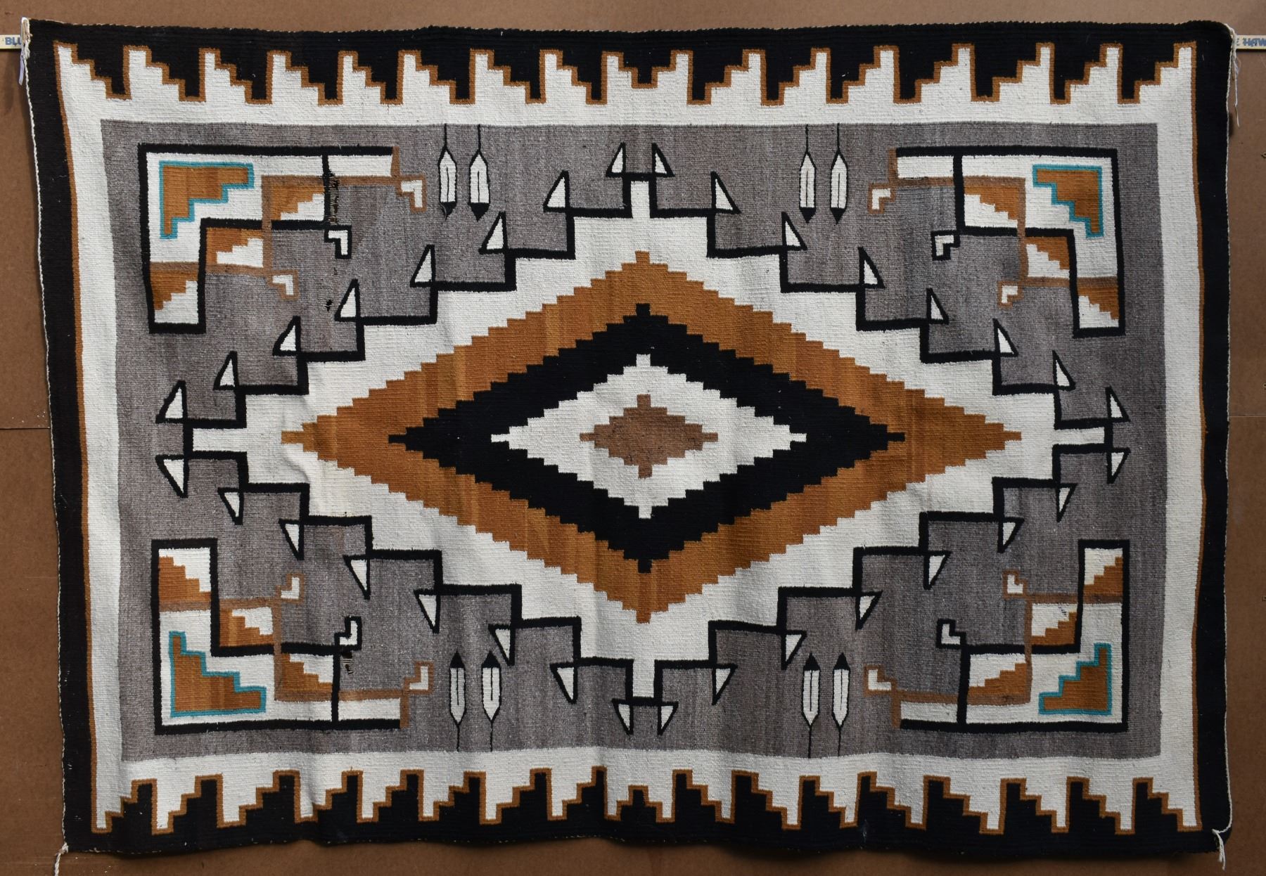 1960-70's Navajo, hand woven geometric and feather design 52" x 78" has moth damage