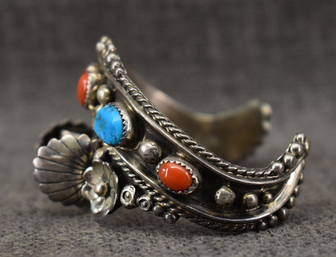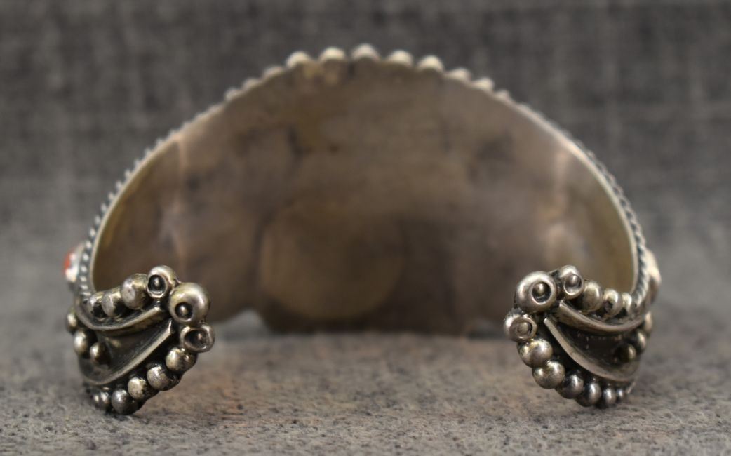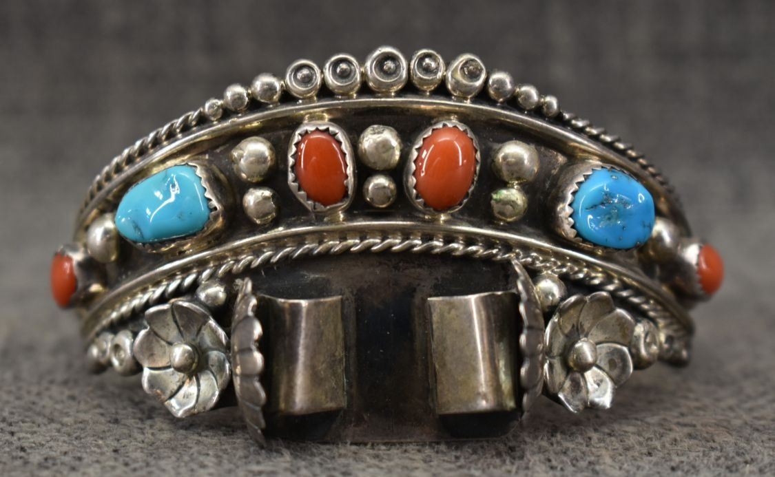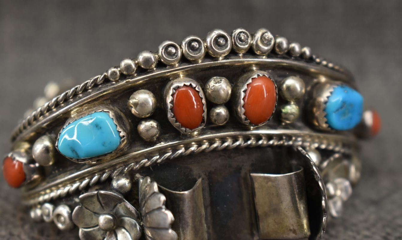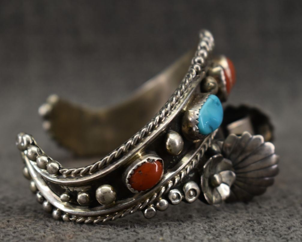 1970-80's Navajo, sterling silver with turquoise and coral stones 1.5" x 5.5" x 1.25" total weight 53 grams