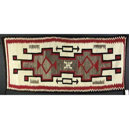 NAVAJO WEAVING: Wool weaving having brown and red border with brown, red and marled brown double cruciform center medallion upon a cream field. Mid-20th c. 41'' x 90''.