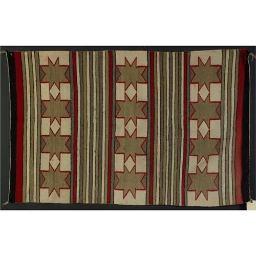 WEAVING: Navajo weaving of natural and aniline-dyed wool having three wide bands with cream wool stars outlined in red and four bands of small stripes, red and deep brown bands at either end. Second quarter 20th c. 60'' x 37.25''