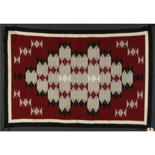 WEAVINGS: Navajo weaving of aniline-dyed wool having black and white border, red ground, grey central medallion with red, black and white double butterfly-form motifs. Late 20th c. 39'' x 25''