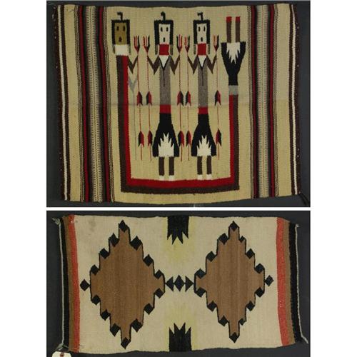 WEAVING: Navajo yei figural weaving of natural and aniline-dyed machine-spun wool having central depiction of three corn people upon a cream ground with striped banding at either end. Mid-20th c. 34'' x 28'' and a Navajo weaving/saddle blanket of native handspun anline-dyed and natural wools having tri-color banding, two diamond forms at central beige field. Mid-20th c. 30'' x 17''