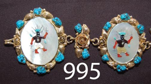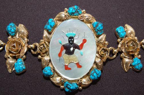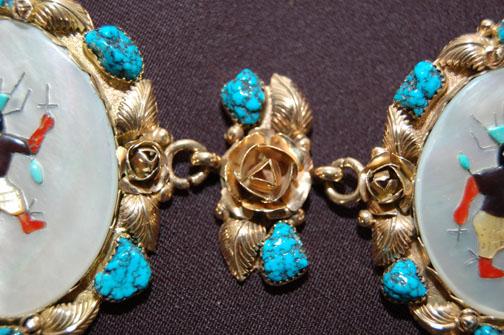 ca 1978 14 k gold, work done by George Henry, Chanel inlay done by Paulene McCray, 8 conchos 2.25”, 9 roses 1.5” x .75”, buckel 2.75”, 32” long.
