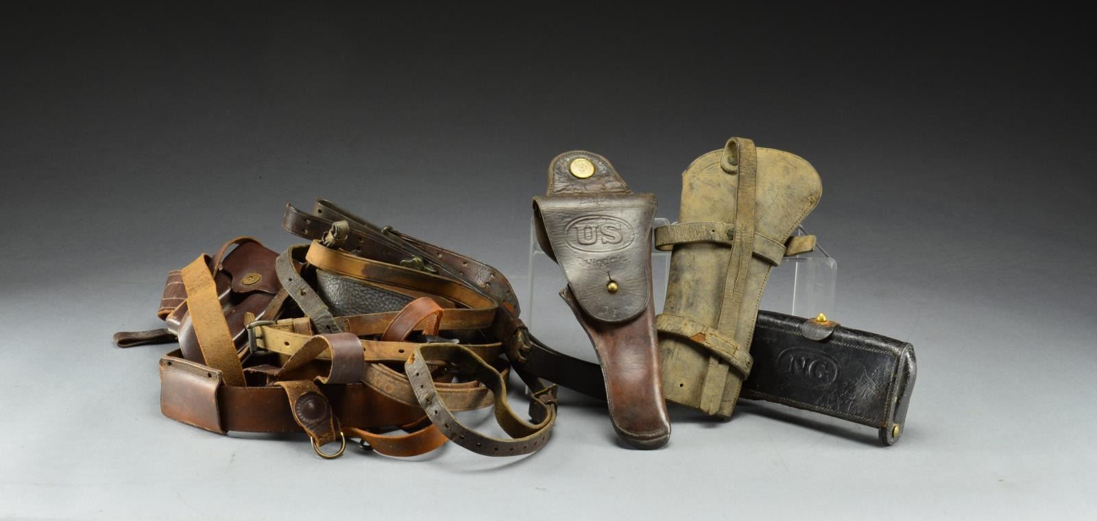 2) LEATHER GROUP. This varied group of leather includes a M1902 officer’s garrison belt w/ all associated sword straps. / A M1921 officer’s Sam Brown garrison belt w/ all associated straps & pouches. / A M1912 ACP holster w/ embossed “US” in oval on the flap. Flap is also stamped, “2 Battery. / Virginia.”. / A well worn M1885 carbine boot. / A McKeever cartridge box w/ embossed “NG” in oval on the front. / A well worn M1851 saber belt w/ no buckle. / A leather drum sling. / 3 Indian War era leather straps. / A rifle sling marked, “L-F CO, 1918” w/ a break. / A Spanish American War era canteen sling. / A M1874 belt w/ no buckle. CONDITION: all items show light to moderate wear except as noted. (02-15749/BF). $600-900.