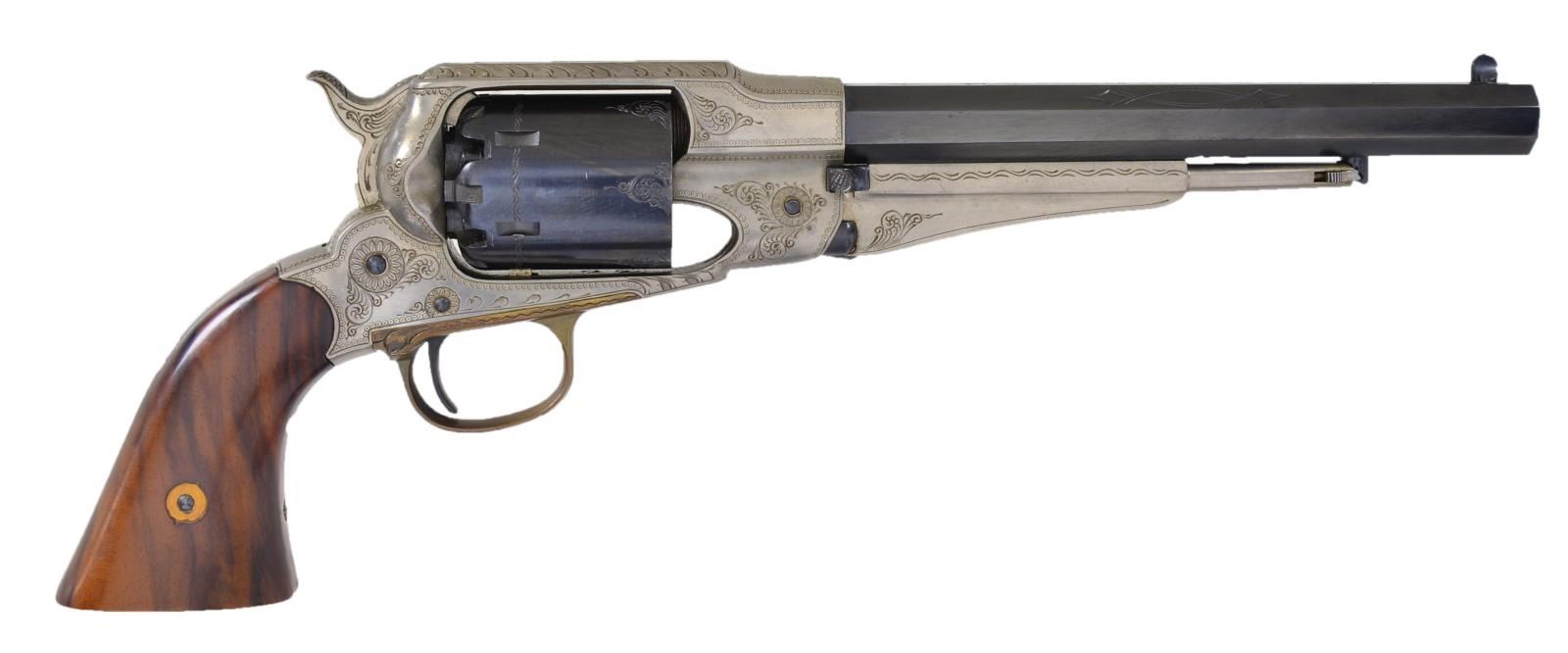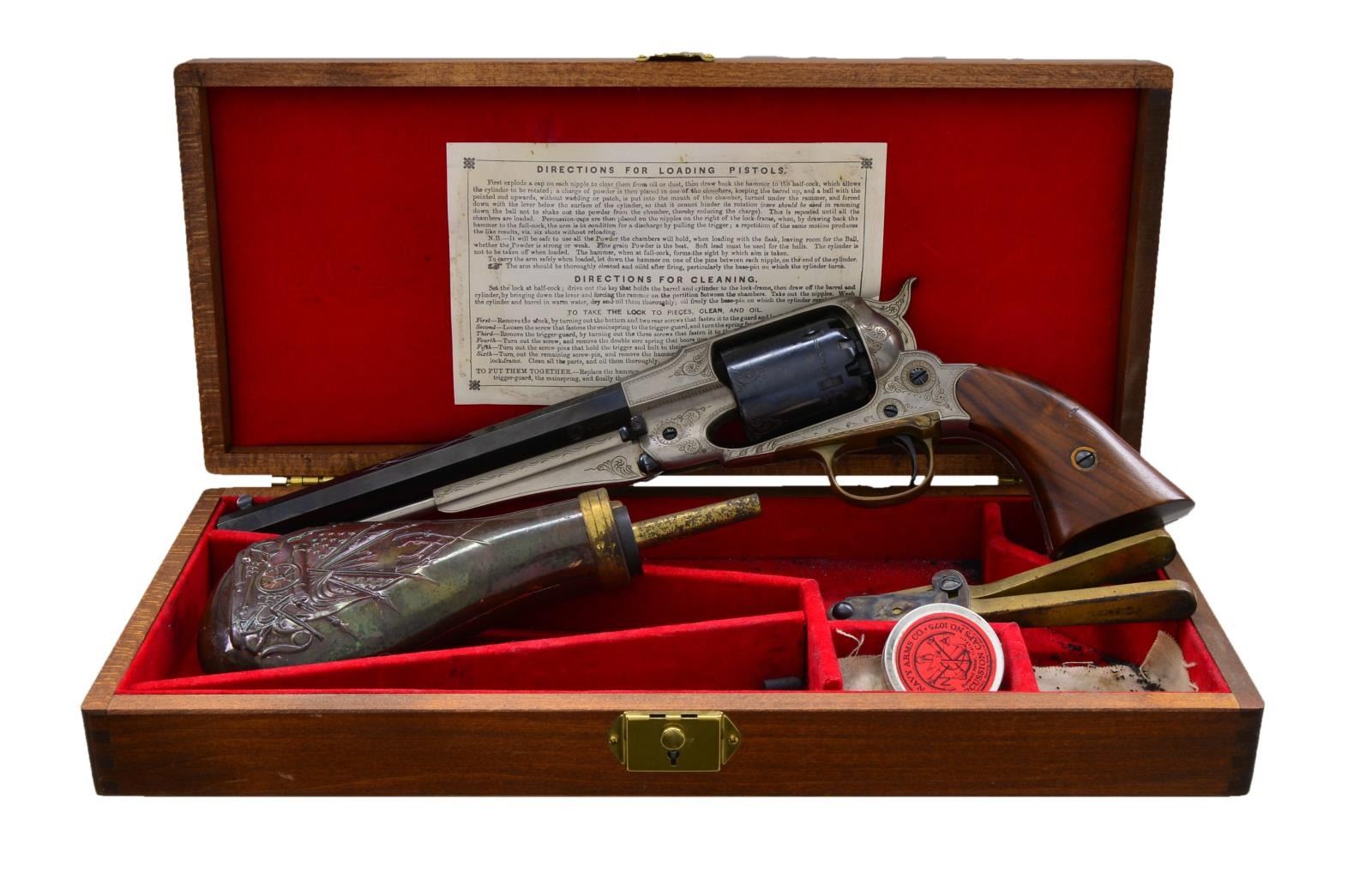 Cal. 44. S# 19215. Bbl. 8" oct. Blued bbl. & cyl. Gray finished frame, ejector rod & grip frame. Brass trigger guard. Scroll engraving. Blade front sight. Walnut grips. UNATTACHED ACCESSORIES: brown cardboard box, wooden case, powder flask, loading tool & cap tin. CONDITION: gray surfaces show a few small spots of light oxidation. Brass trigger guard is a dull yellow patina. Blued surfaces retain 97% original blue. Very good plus bore. (01-21340/MJC). ANTIQUE. $400-600.