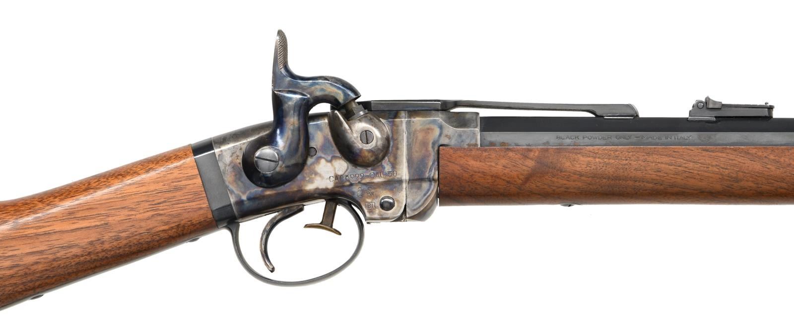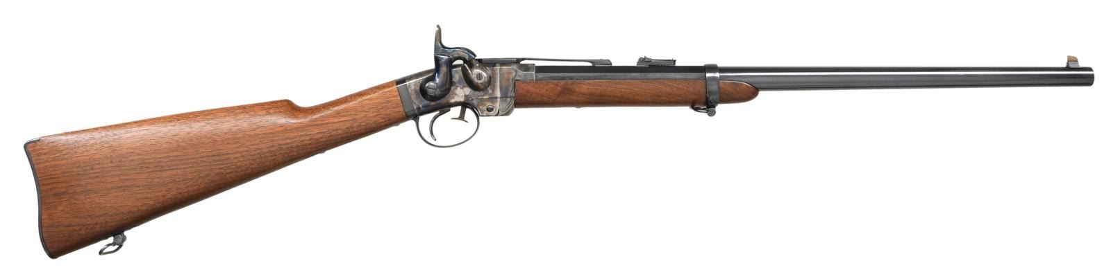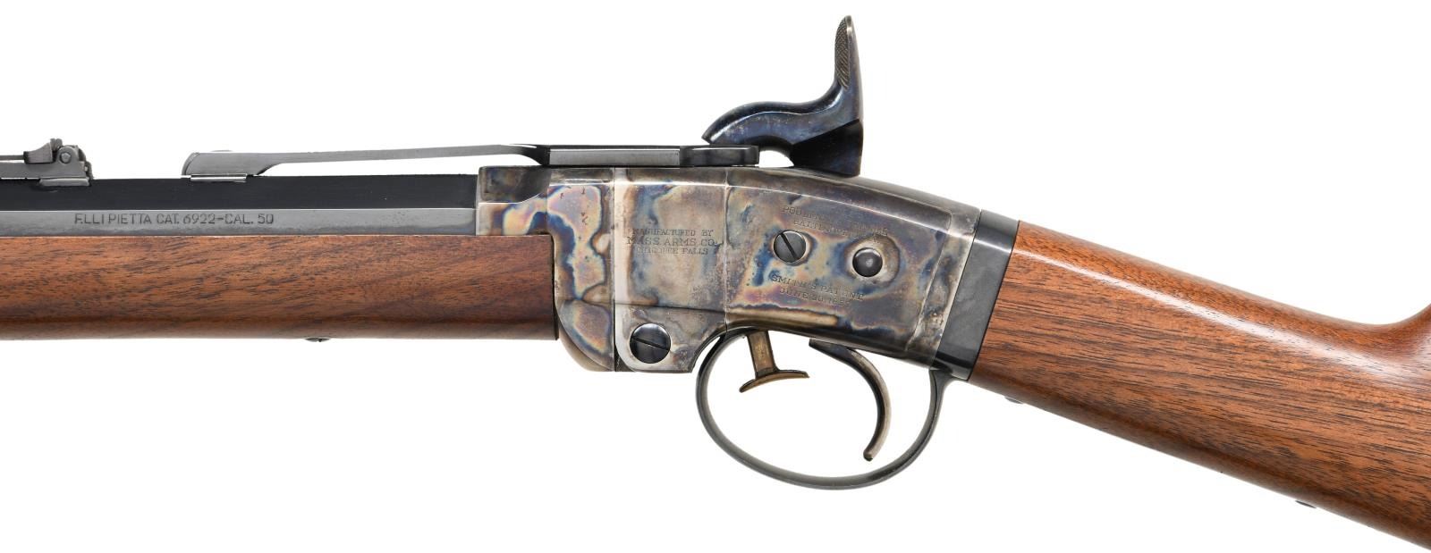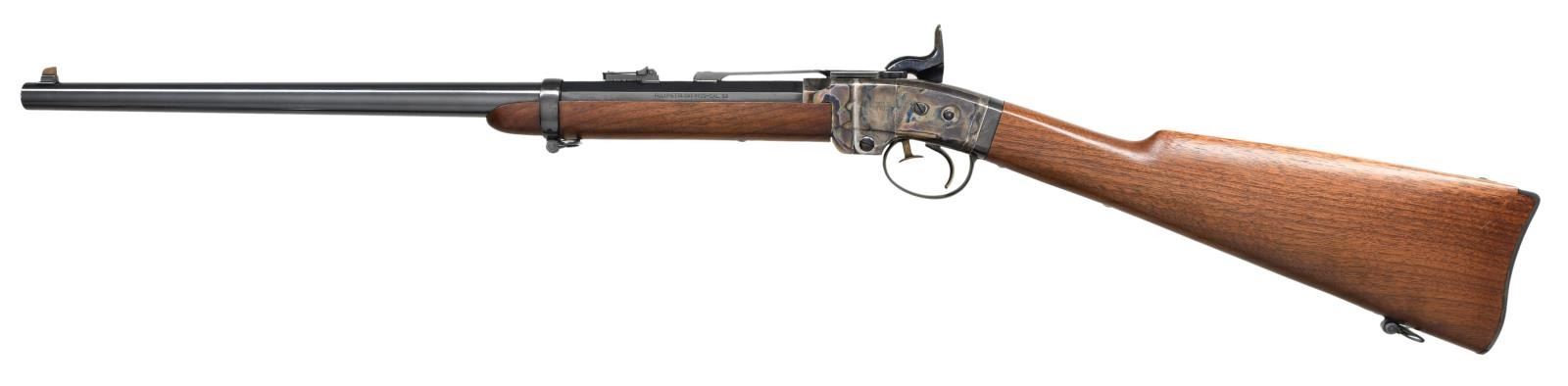 Cal. .50. S# 3390. Bbl 21 1/2". Case color hardened frame, hammer, and trigger, with blued barrel, trigger guard, and buttplate. Solid wood buttstock and forend. Brass blade front sight with V-notch rear sight. CONDITION: metal components retain the majority of their original factory finishes, exhibiting a couple small spots of mild wear, some superficial marks from handling and storage, as well as some scattered spots of oxidation on the frame and barrel. Mirror bore, exhibiting well defined rifling throughout. Stock shows a few minor superficial handling marks, but is otherwise very good. (01-23709/MLW). ANTIQUE. $400-600.