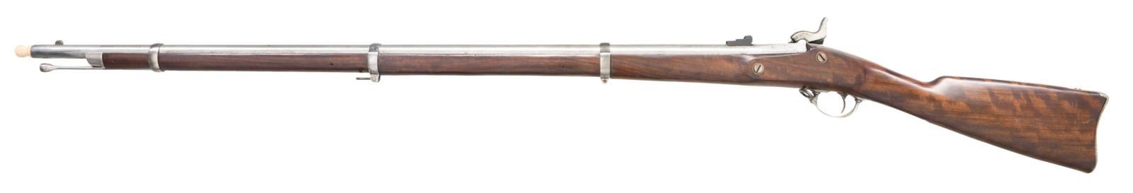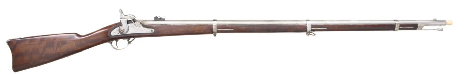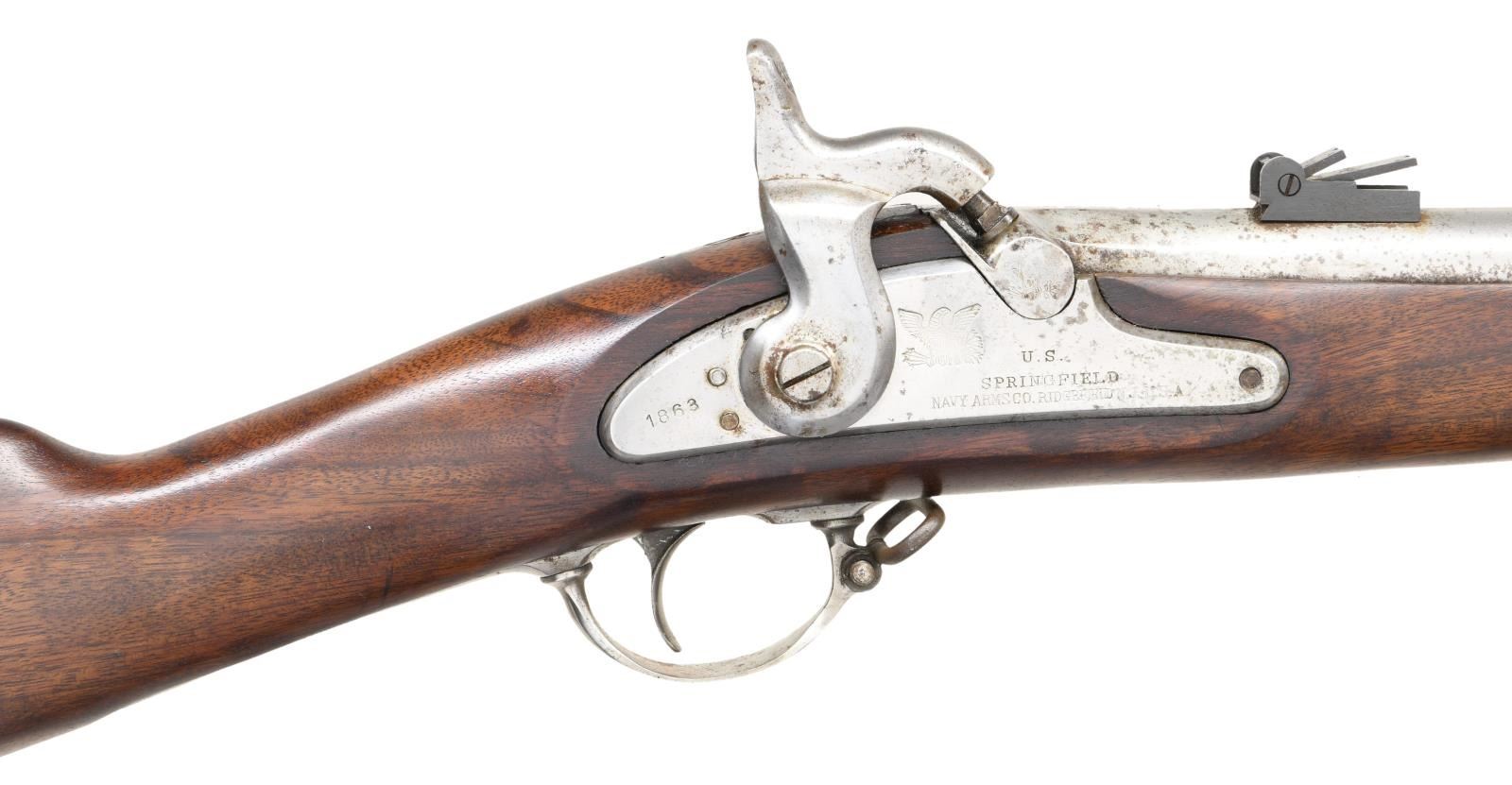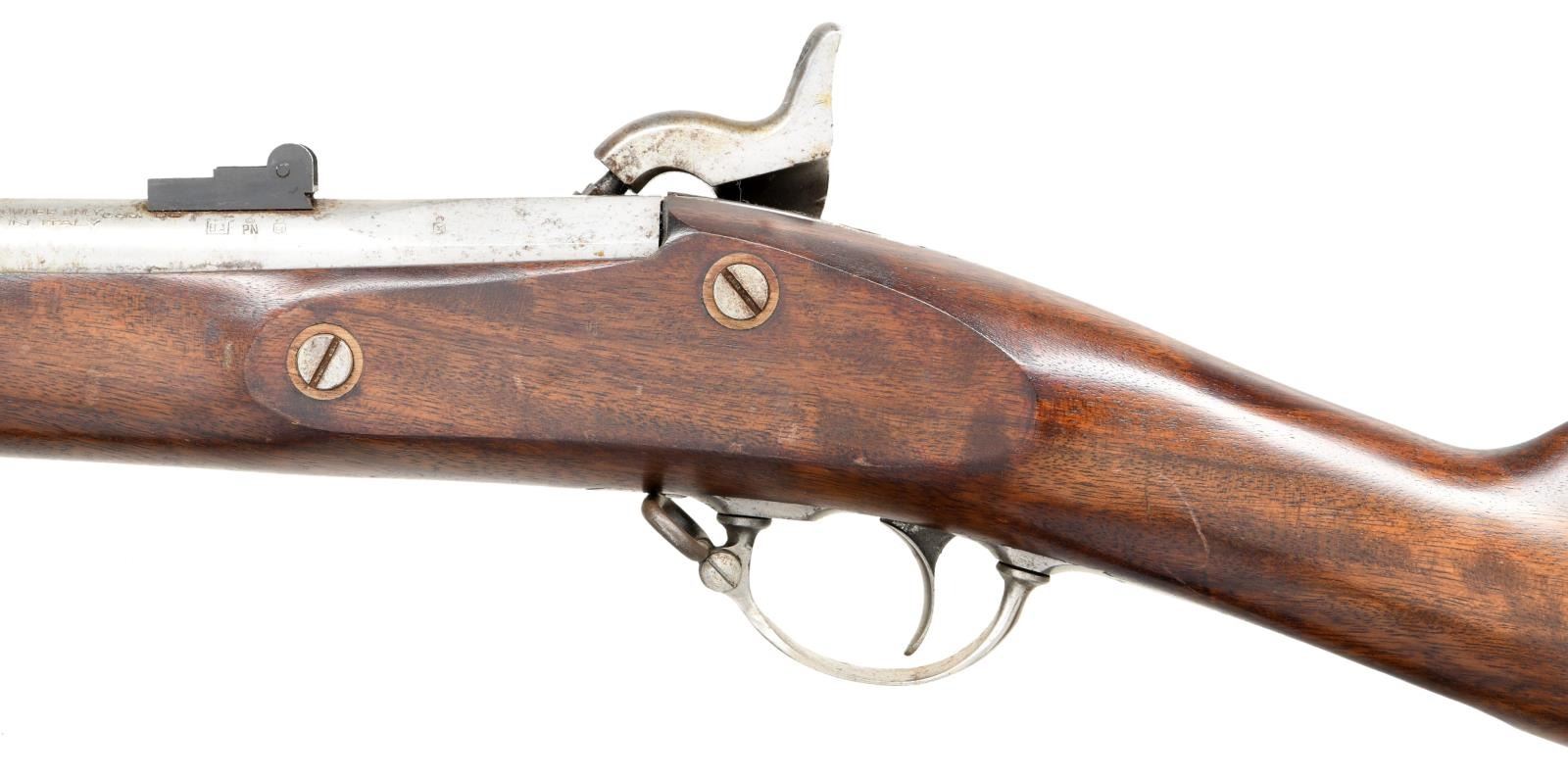 . Cal. 58. S# S5507. Bbl. 40". Italian made repro 1863 Springfield musket. 2-leaf rear sight. Blade front sight. Lock marked w/ 1863 date, US Eagle, U.S. Springfield & Navy Arms markings. Bbl. has Italian proofs & another Navy Arms marking. Brightly finished metal. Walnut stock w/ bottom mounted sling swivels. Ramrod present. UNATTACHED ACCESSORIES: wooden muzzle cap. CONDITION: stock shows scattered flaking, scratches & handling wear. Metal remains partially bright w/ scattered oxidation & areas turning gray. (01-23763/MJC). ANTIQUE. $300-400.